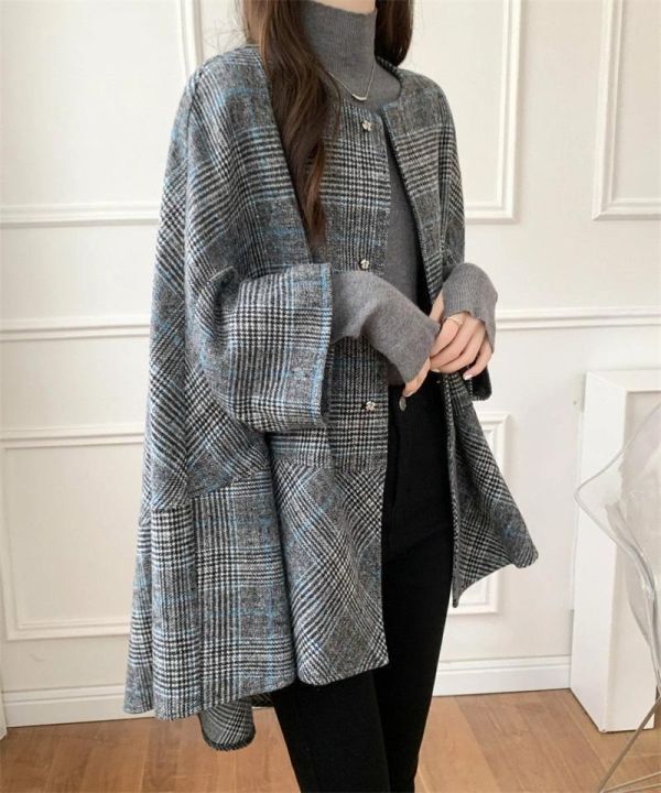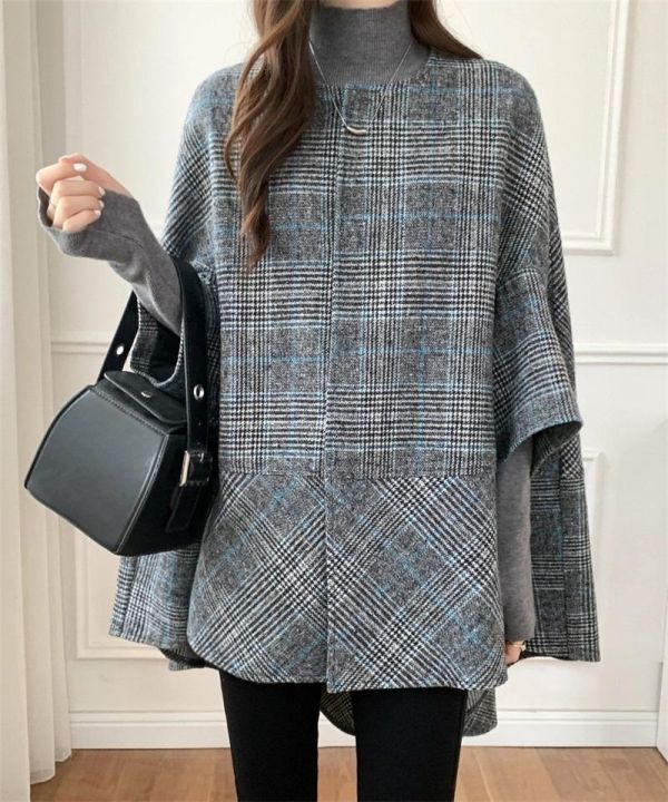 人気推薦/ポンチョコート ウール調 マント 冬 アウター ドルマン ケープ Aライン ケープ風 ジャケット チェック柄 防寒 体型カバー/ブルー