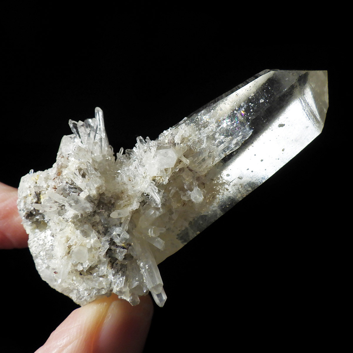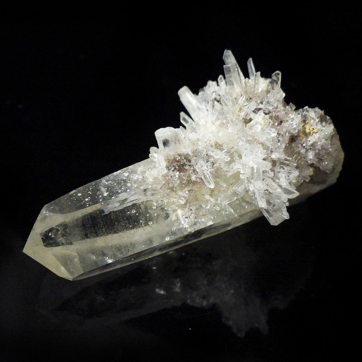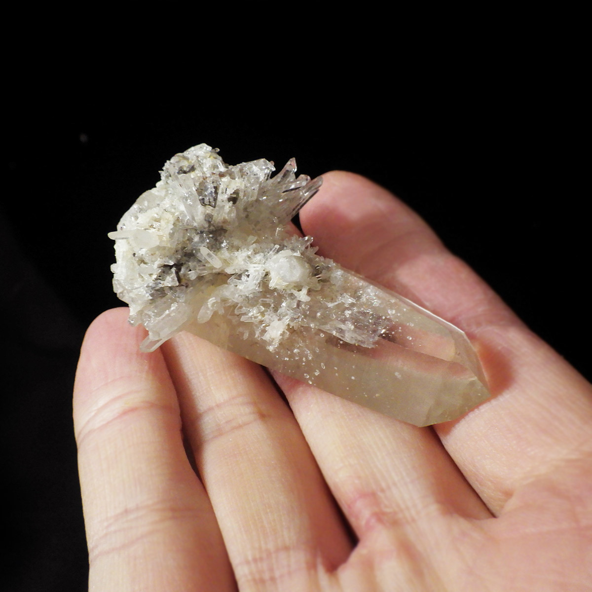 ペルー産の水晶ポイント原石です。水晶ポイントの表面に細かな水晶の結晶が乗っかったクォーツ on クォーツになっております。ちょっと変わったカッコよさがあります。透明度もあり、水晶内部もキラリとしてきれいです。