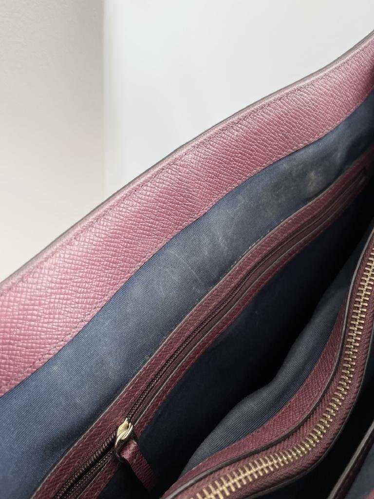【状態】正面ロゴと底と底鋲に傷、持ち手内側と内布にかなりお汚れあり