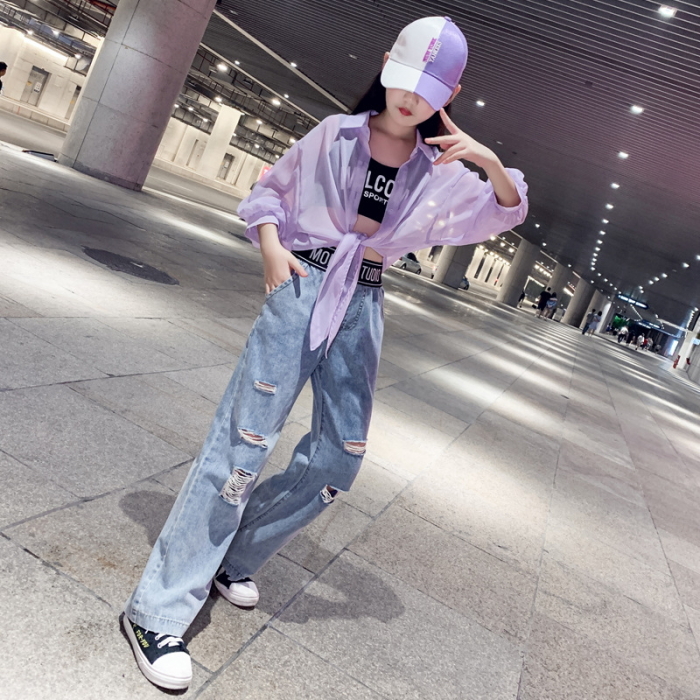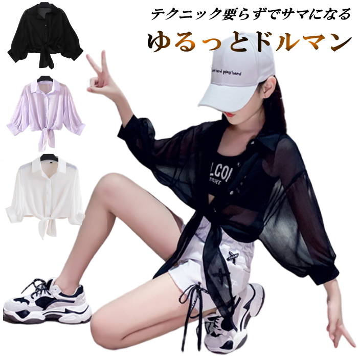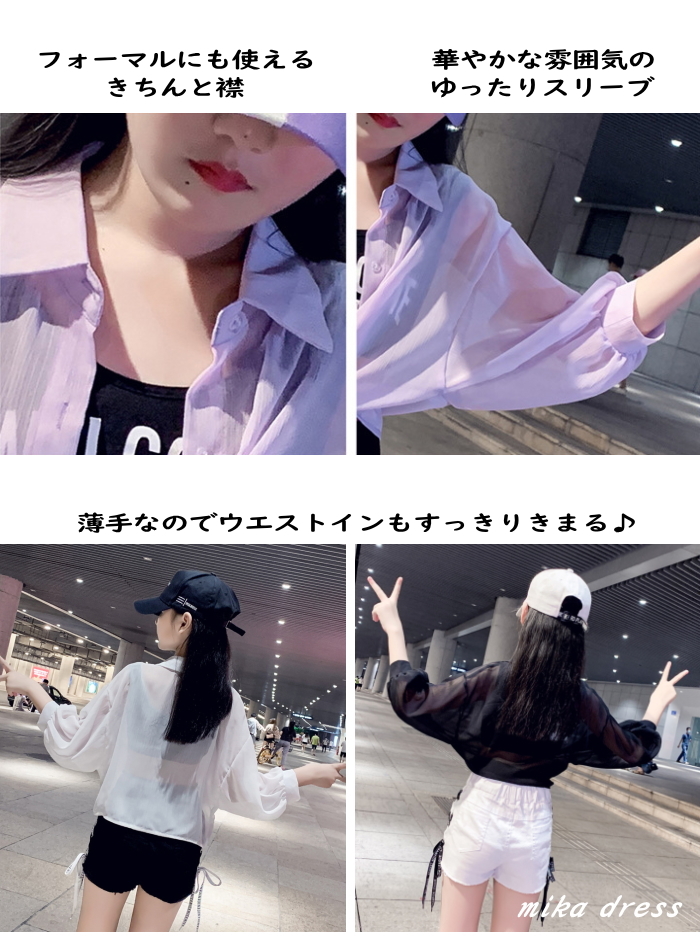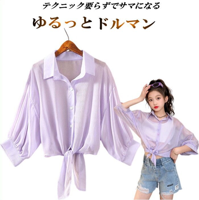 キッズダンス シアー トップス【パープル】ダンス 衣装 ガール 前結び シャツ ボレロ シースルー へそ出し ショート 襟付cy10n-p0