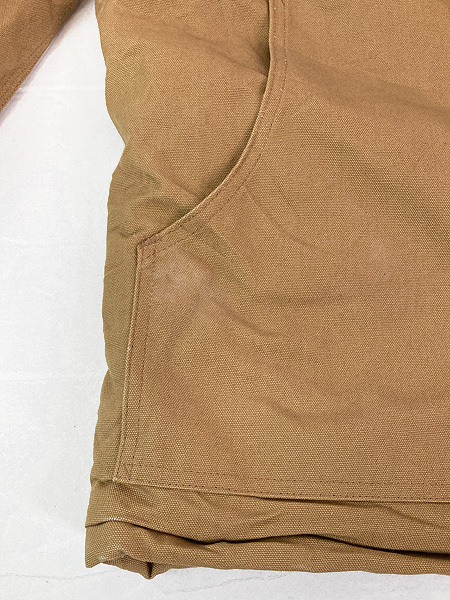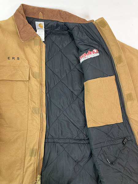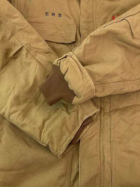 襟コーデュロイ、フロントはジップとベルクロの二重構造、裏地は中綿入り黒のナイロンキルティング、袖内側リブ付きで防寒性も期待できます。