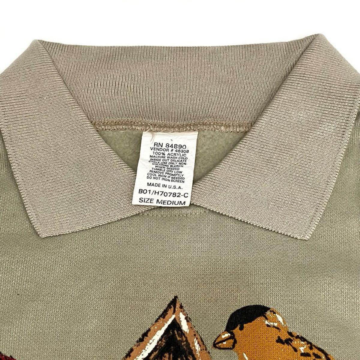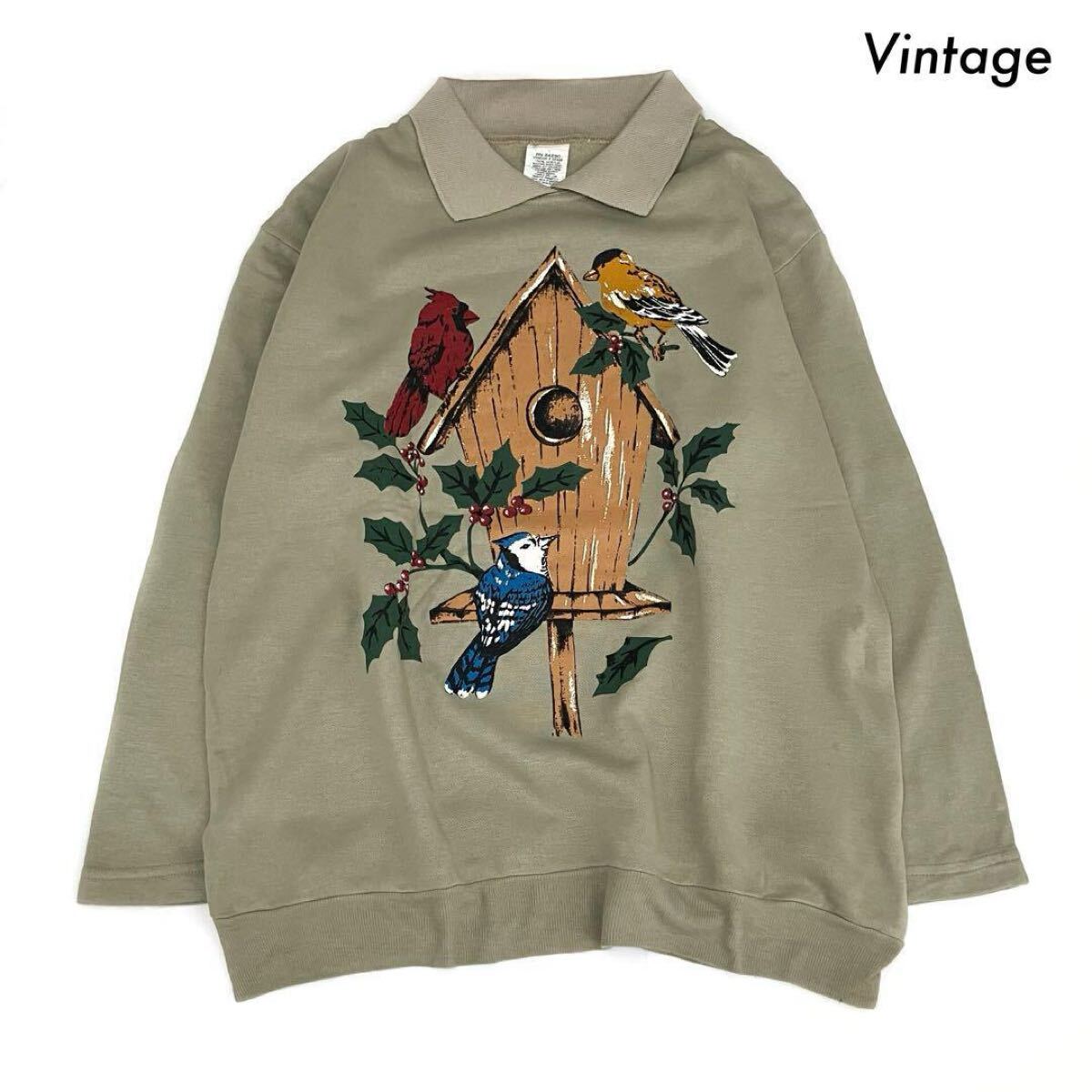 古着 長袖スウェット トレーナー 襟付き 小鳥 アグリー 裏起毛 カーキ USA製 古着男子 古着女子