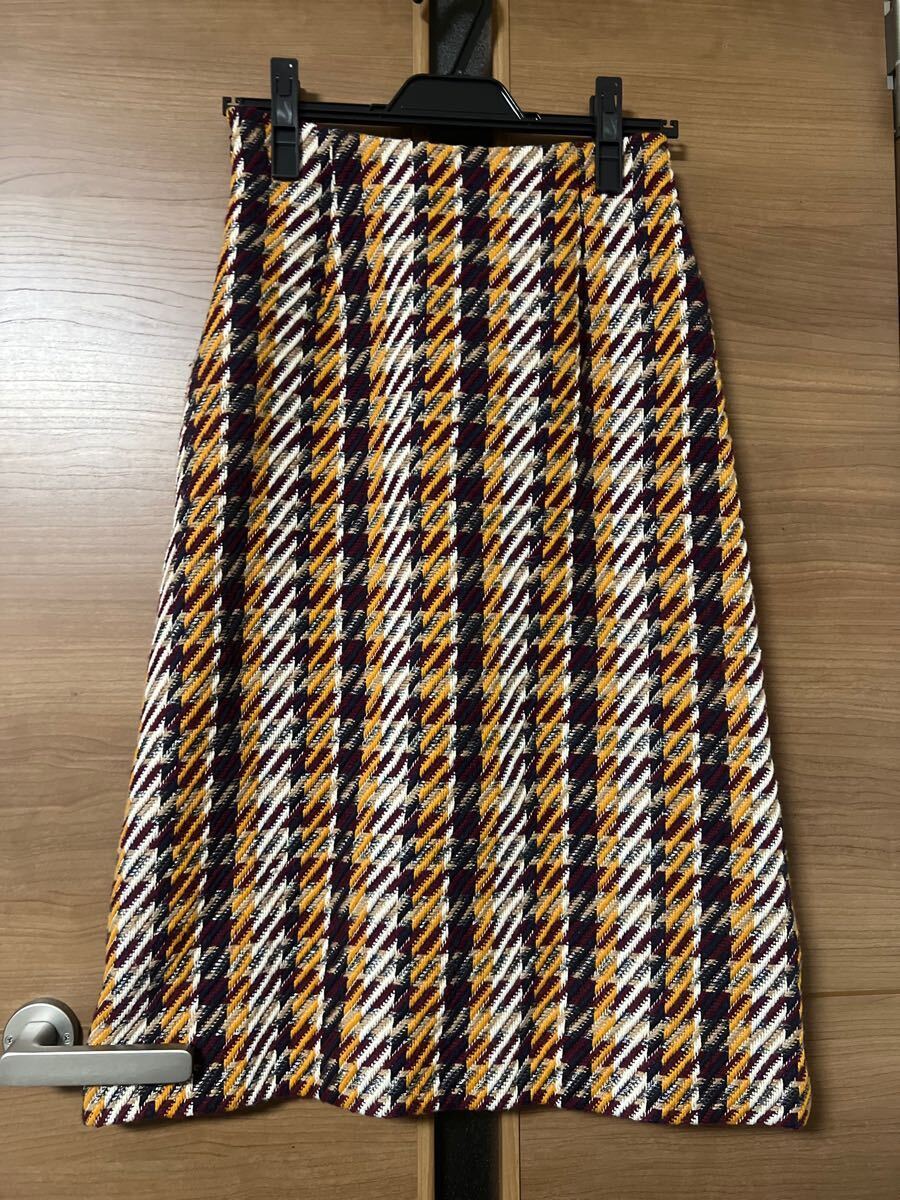 ドレステリア カルゼミックスツイードスカート 1万9800円のお品 スタイリスト私物 特徴的な柄が印象的なミモレスカートで、フレア感を抑えたAラインのシルエットが甘すぎない、大人の雰囲気が魅力のお品です サイズ36 M前後くらい ウエスト68ヒップ86丈69センチくらい 素材: 表地: ポリエステル40 コットン30 毛25 ナイロン3 レーヨン2% 裏地: キュプラ100% ホワイト、ブラック、イエロー、ボルドーなどマルチカラー 2回着用のみのとてもきれいなお品です