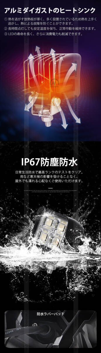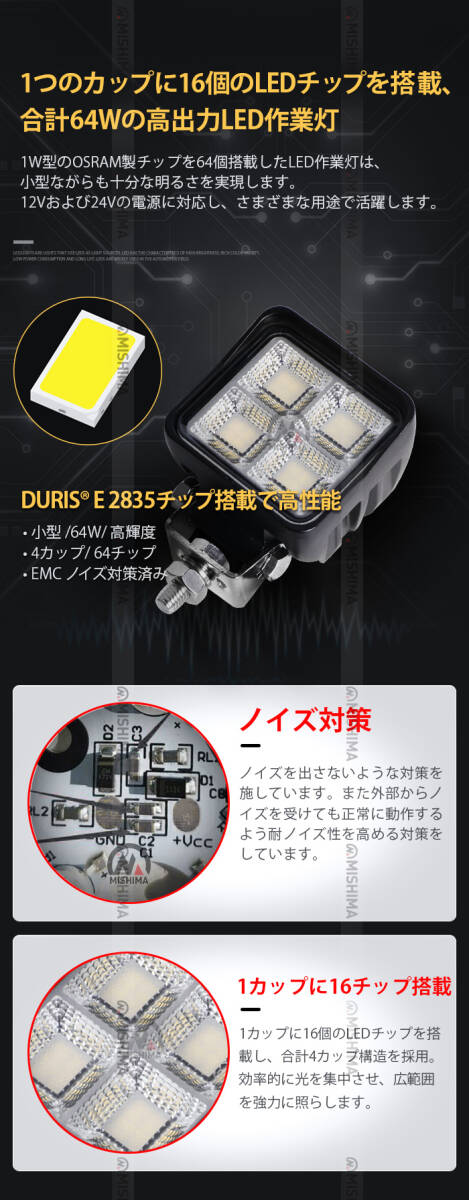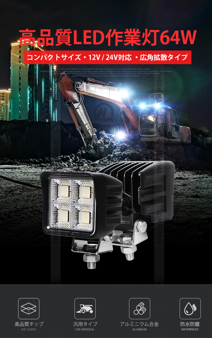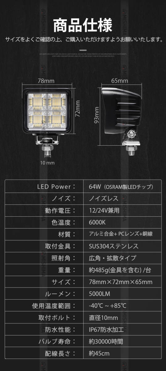 msm8864【2台】小型 軽量 LEDワークライト 作業灯 1年保証 64W 農業 漁業 建設 警備 工事 軽トラ トラック 12V 24V 広角 拡散 荷台灯 防水