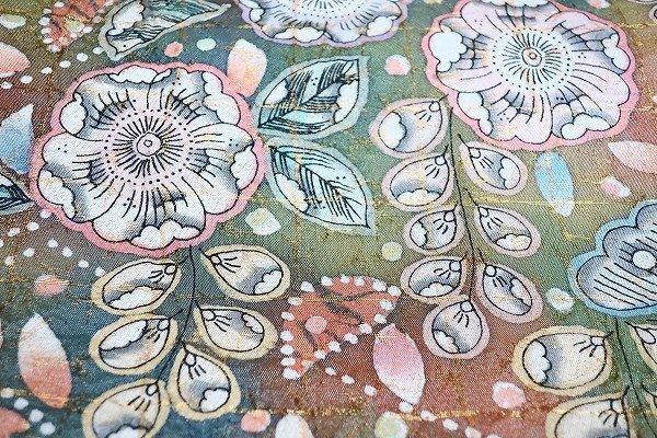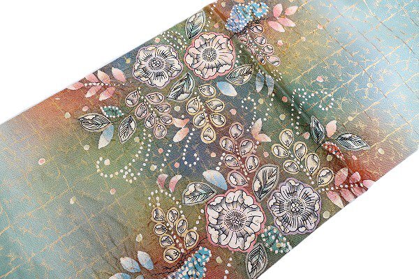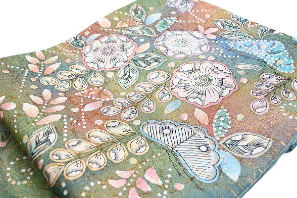 くすみブルーの金通し地に、辻が花文が描かれた袋帯です。 柄には絞り加工も施されています。 |