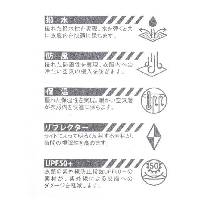 裏面に配置されたボア素材と起毛トリコットメにより暖かく蓄えられた空気は衣服内の保温性を高め、冬の過酷な環境下においても常に着内に温かい空気をキープさせ、運動パフォーマンスの低下を防ぐ。