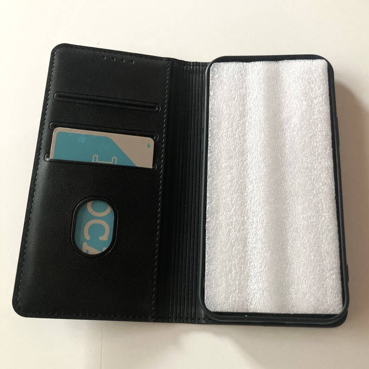 手帳型でカードはカバーの内面に隠れます。マグネットもついているのでバッチリ隠せます。肌触りの良い合皮でつくられており、高級感が漂います。