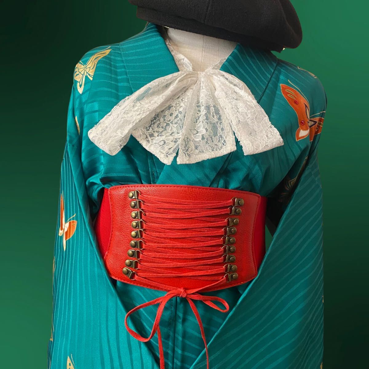 着崩れ防止、強度を持たせるために太めのウエストゴムを使用しております。また、お着物の形を最大限に活用した特性上、ウエスト部分の布が厚くなっています。ベルト等を装着するとお写真の様に目立ちません。
