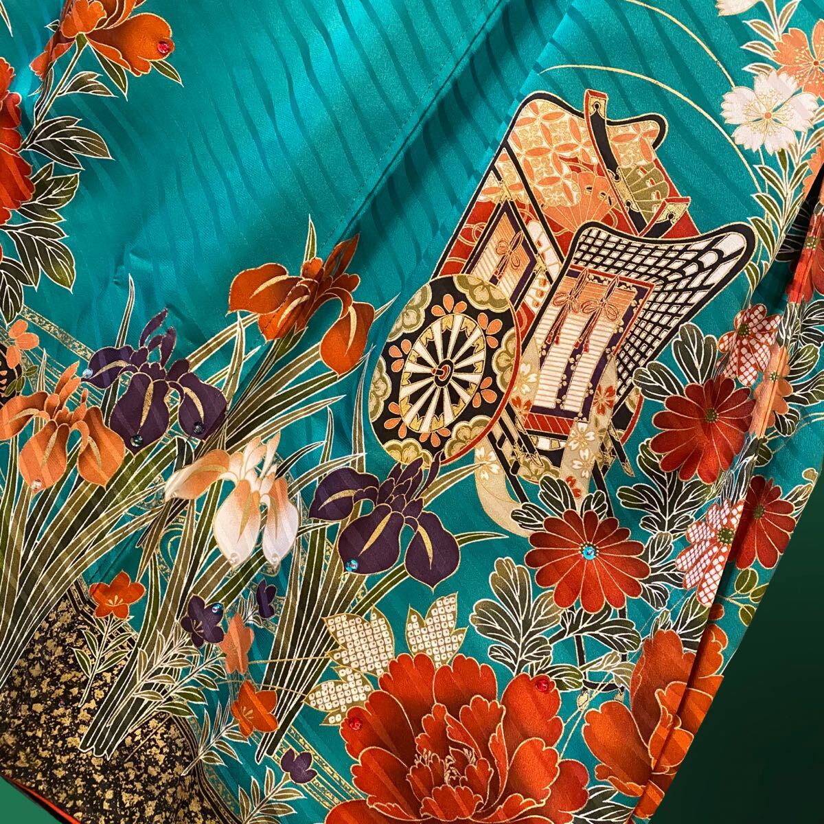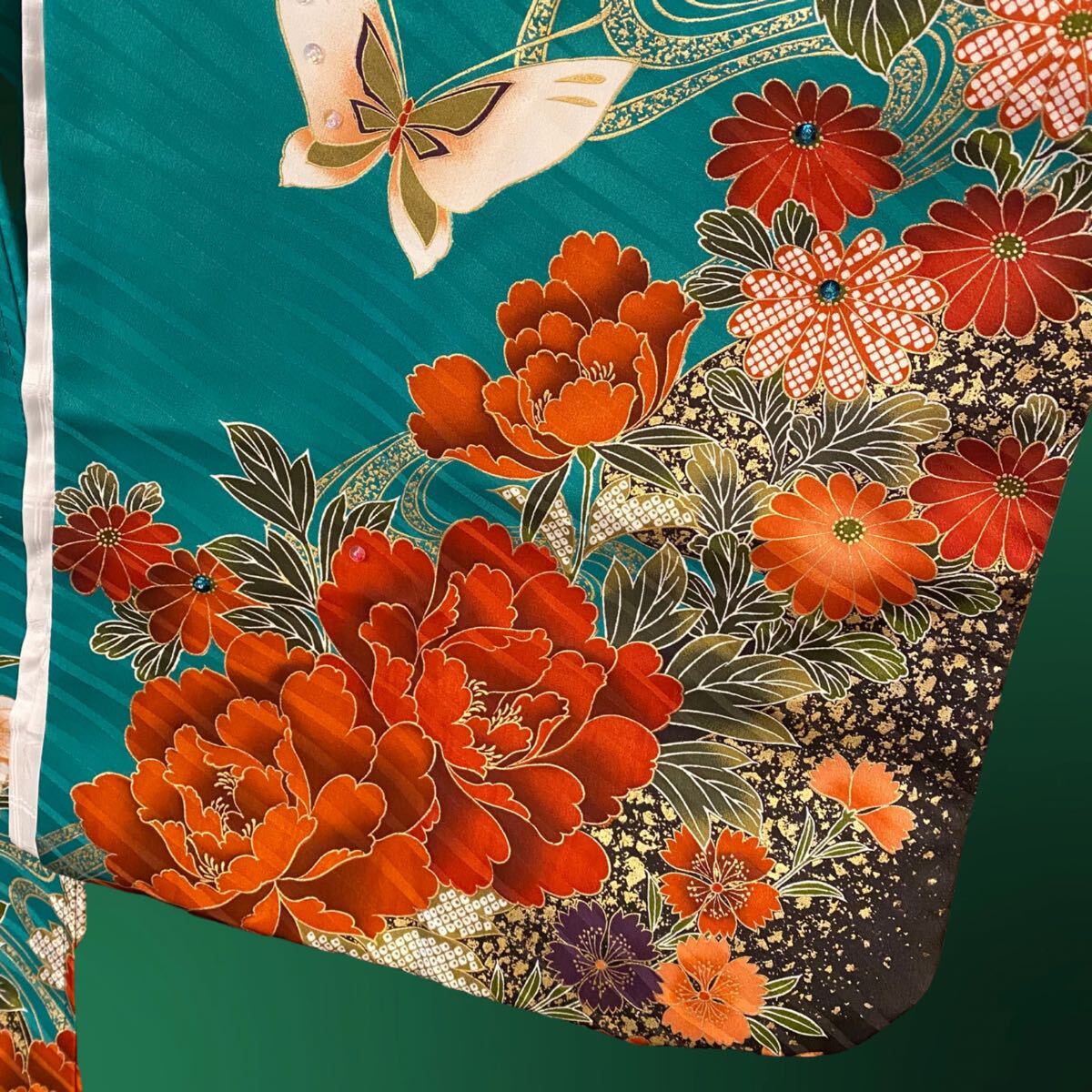 洗練された和洋折衷のデザインが特徴の振袖ロングワンピース。鮮やかなグリーンの生地に豪華な花々と美しい蝶のモチーフが描かれ、晴れやかな場にふさわしい豪華さを持ち合わせた一着です。光を受けて輝くスパンコールがエレガントな印象を与え、シックな和の装飾も施された、特別な機会にもおすすめのデザインです。