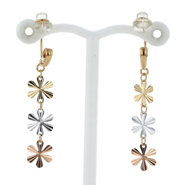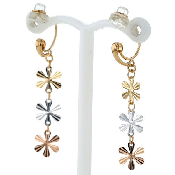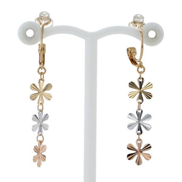 | 商品紹介 | イエローゴールド、ホワイトゴールド、ピンクゴールドで作られたイヤークリップです。 3色のフラワーモチーフを3連にセットしています。 揺れて、可愛らしいデザインです。 |
