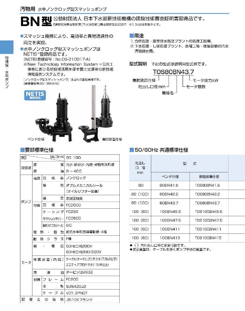 〈ツルミ〉80BN42.2 50Hz 東日本用 汚物水 水中ノンクロッグ型スマッシュポンプ BN型 口径80mm 出力2.2kw ツルミポンプ 代引不可
