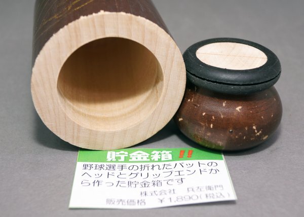 | 商品説明 | バット材 野球バット貯金箱 株式会社 兵左衛門 野球選手の折れたバットのヘッドとグリップエンドから作った貯金箱です。 サイズ:W65㎜×D65㎜×H125㎜ |