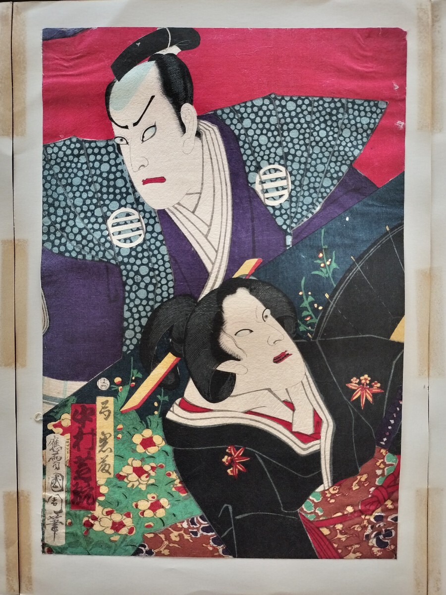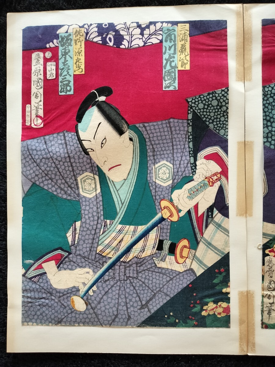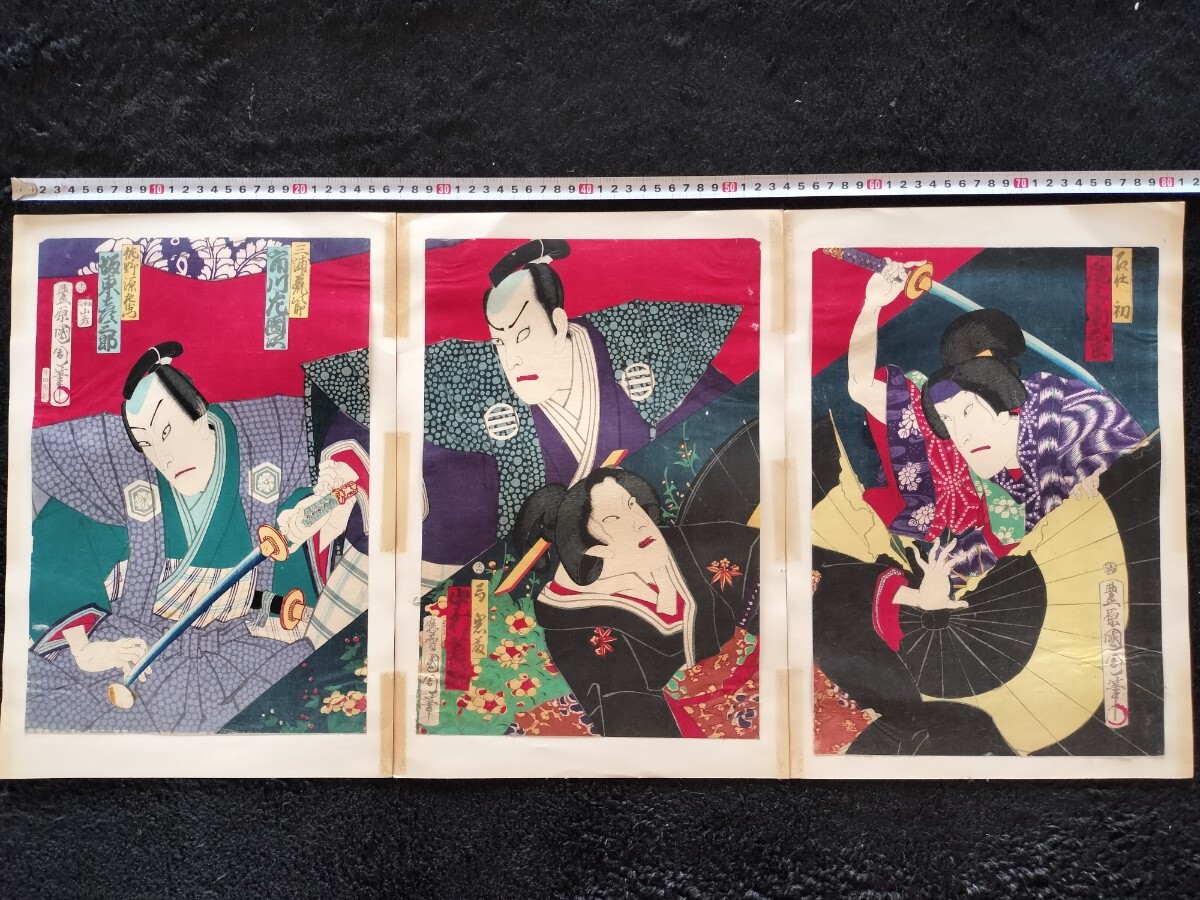 明治期/真作 豊原国周 本物浮世絵木版画 歌舞伎絵 役者絵 芝居絵 錦絵 大判 三枚続き 裏打ち