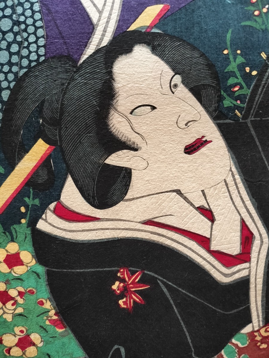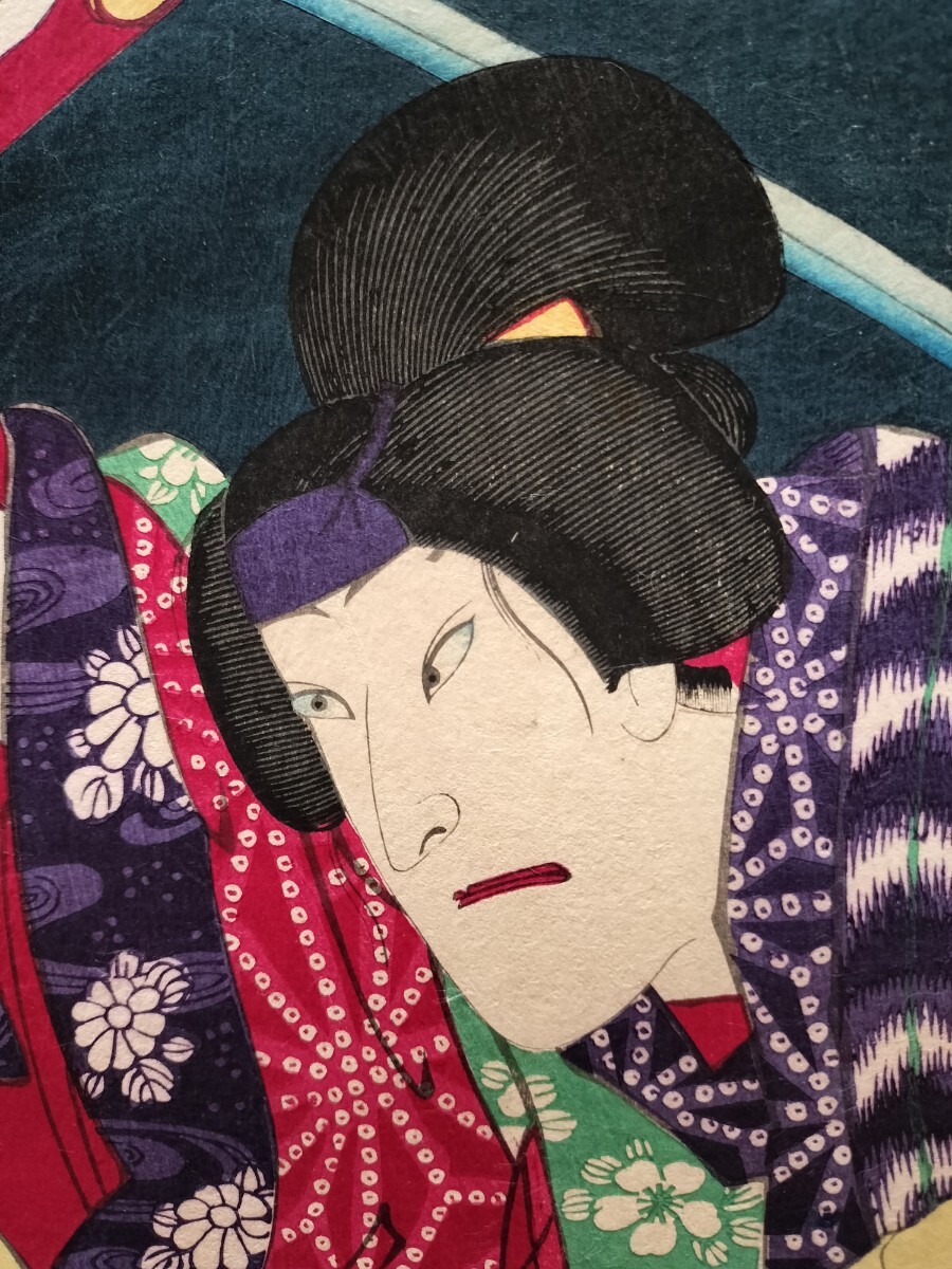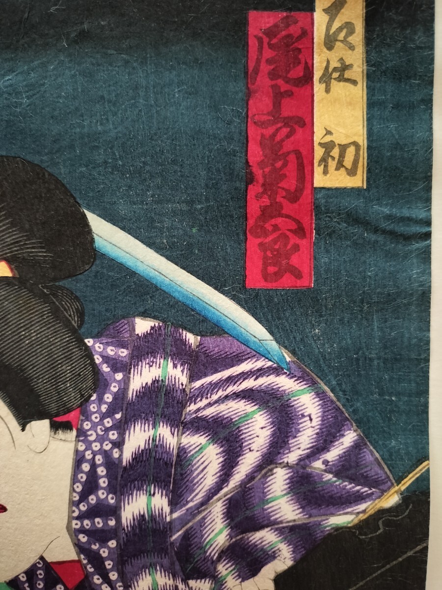 明治期/真作 豊原国周 本物浮世絵木版画 歌舞伎絵 役者絵 芝居絵 錦絵 大判 三枚続き 裏打ち