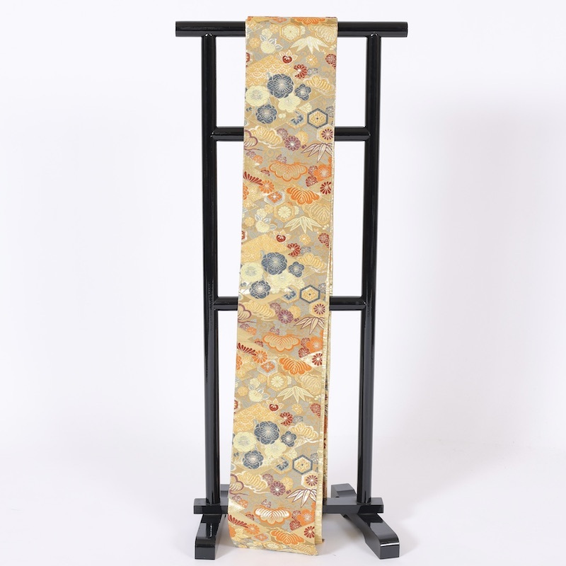 表はゴールドに古典の柄、裏は幾何学模様のゴールドの両面使いの帯になります。良いものだけが持つゴールドの発色を楽しんでください。