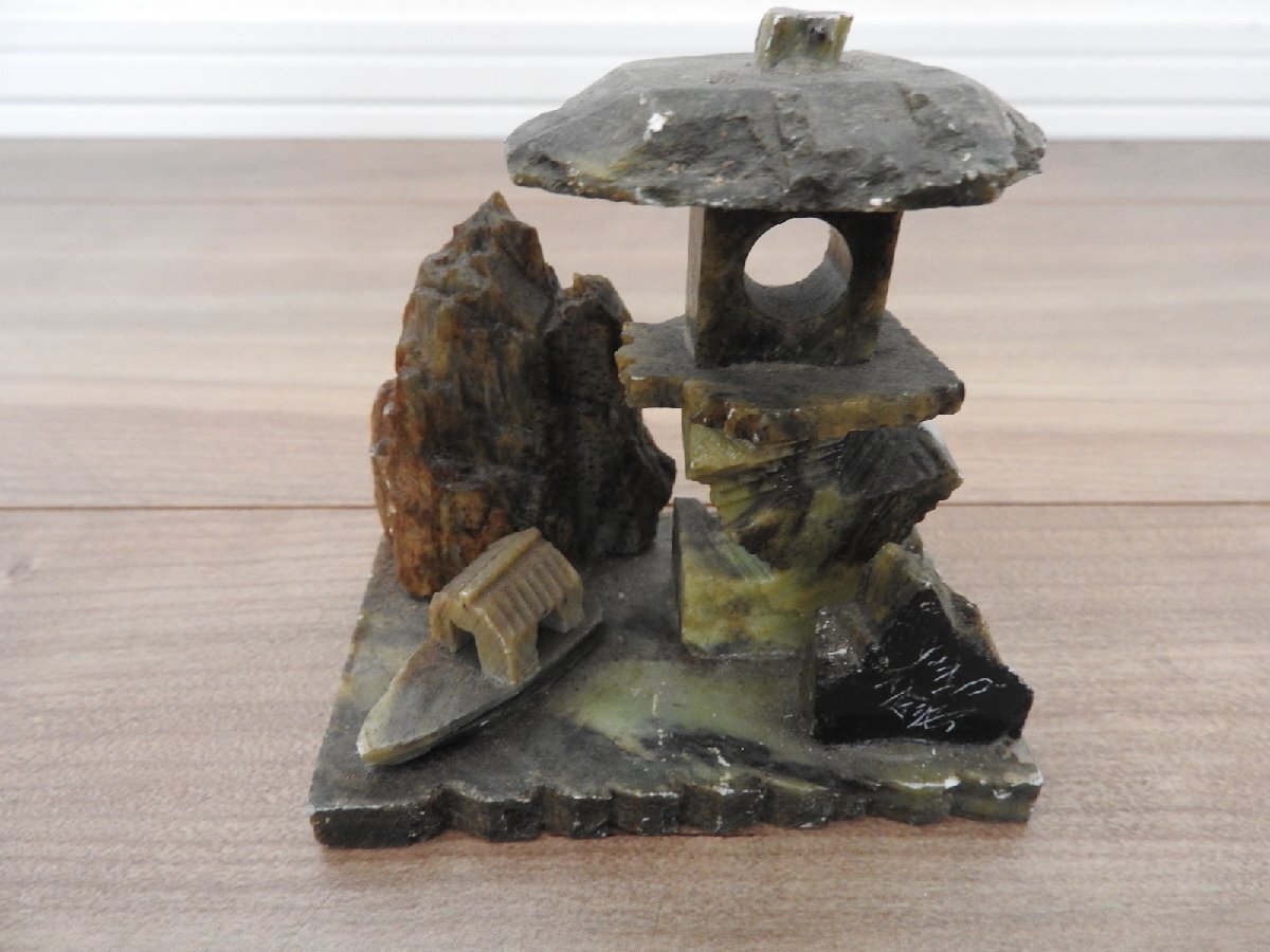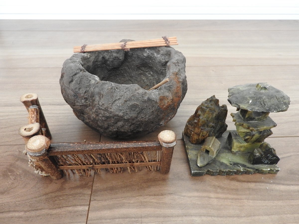 茶道具 茶会 ミニチュア オブジェ 置物 になります。 比較的綺麗な状態かと思います。 【サイズ】 石 ぶオブジェ 幅 7.5㎝ 奥行 4.7㎝ 高さ 7㎝ 陶器 井戸オブジェ 直径 11.5㎝ 高さ 7㎝ 写っているものが全てです。 状態も含めて写真にてご確認下さい。 | ||||