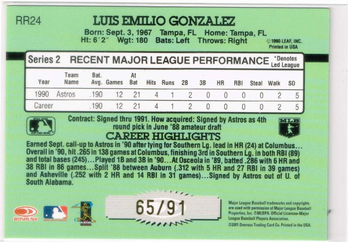 MLB メジャーリーグ ベースボールカード の 2001 Donruss Rookie Reprints Autograph #RR24 Luis Gonzalez シリアルナンバー 65/91 です。 終活のため、コレクションとして長年保管していたものを出品いたします。思い入れがあるカードですので大切にしてくださる方のお手もとに行くことを願っております。 サイズは90mm × 63mmです。 カードは入手後スリーブ、トップローダーに入れて暗所にて保管しております。一般的な常識の範囲内で保管をしておりました。その他初期傷や経年による自然劣化などはご容赦ください。カードの両面の画像を掲載しておりますのでご確認ください。 当方、喫煙者はおりません。 その他、何かご質問がございましたらお問合わせください。 | |