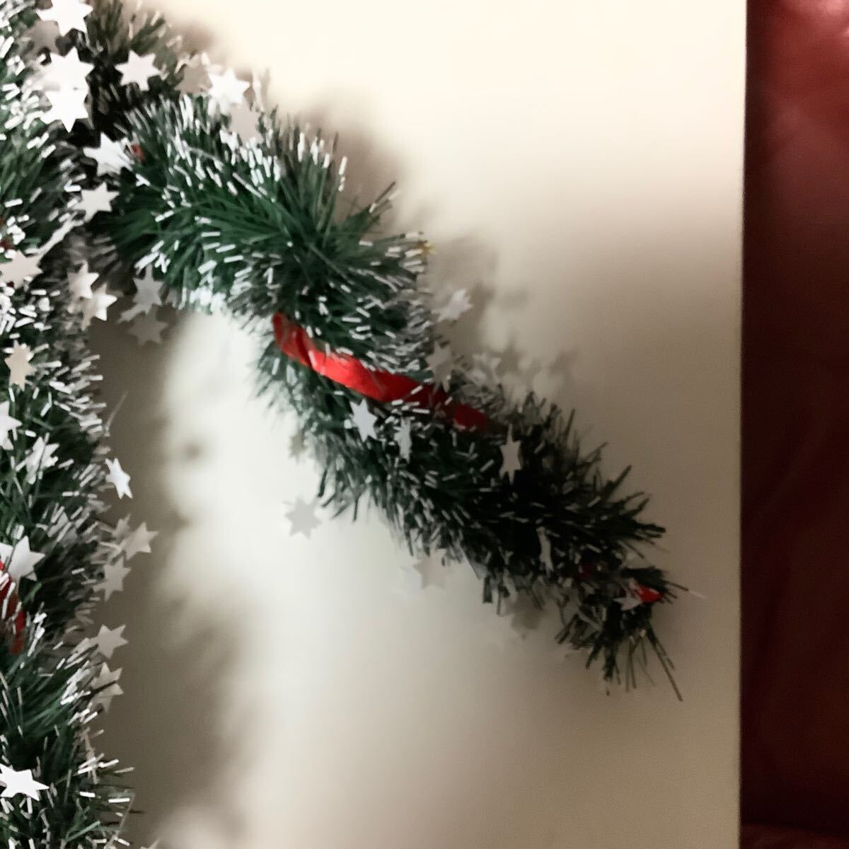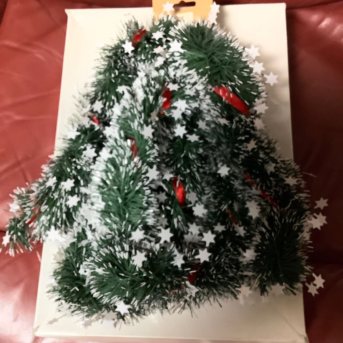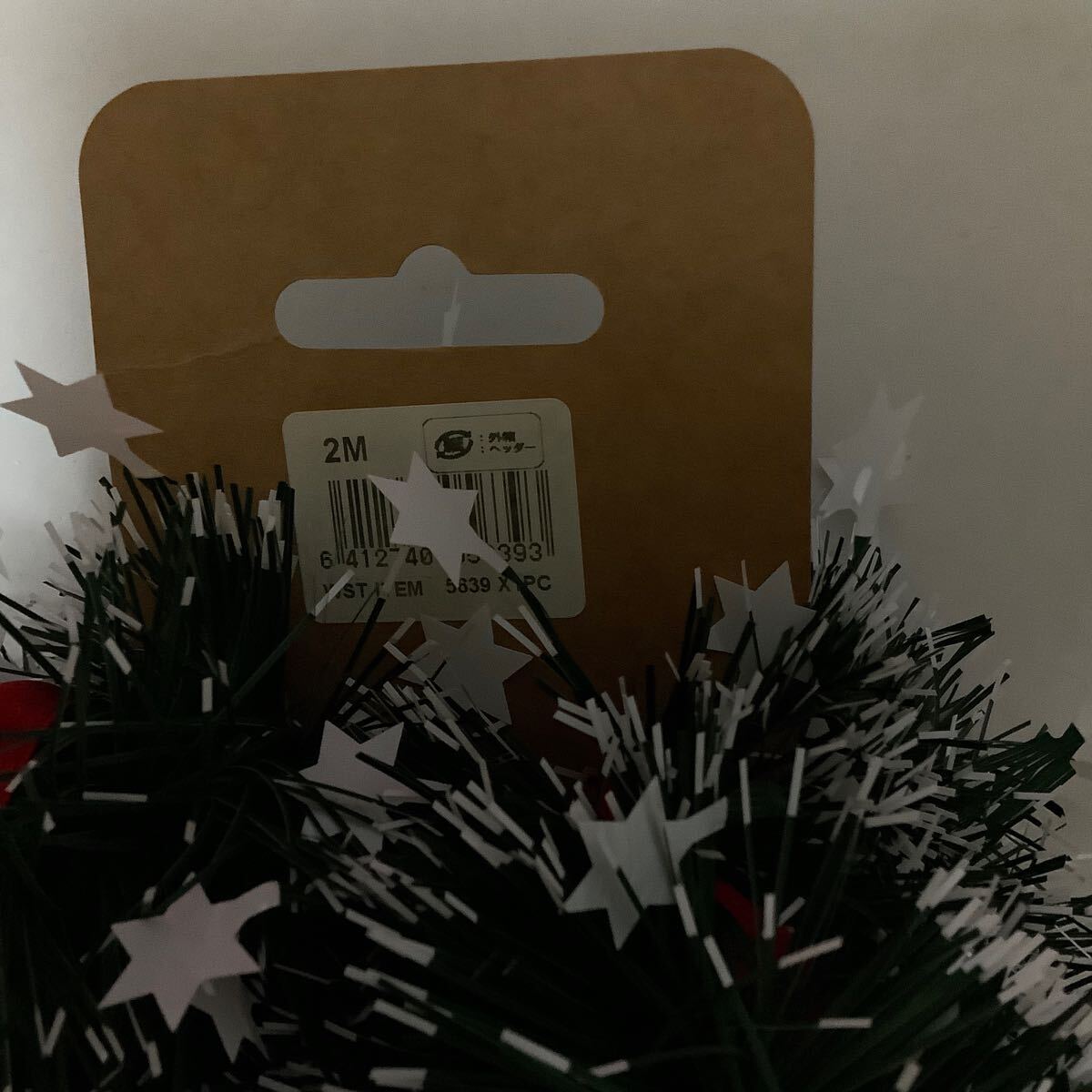 ◯ 緑のモールに赤いリボンが斜めに巻き付けられており、白いお星様が散らばって付いてます。
