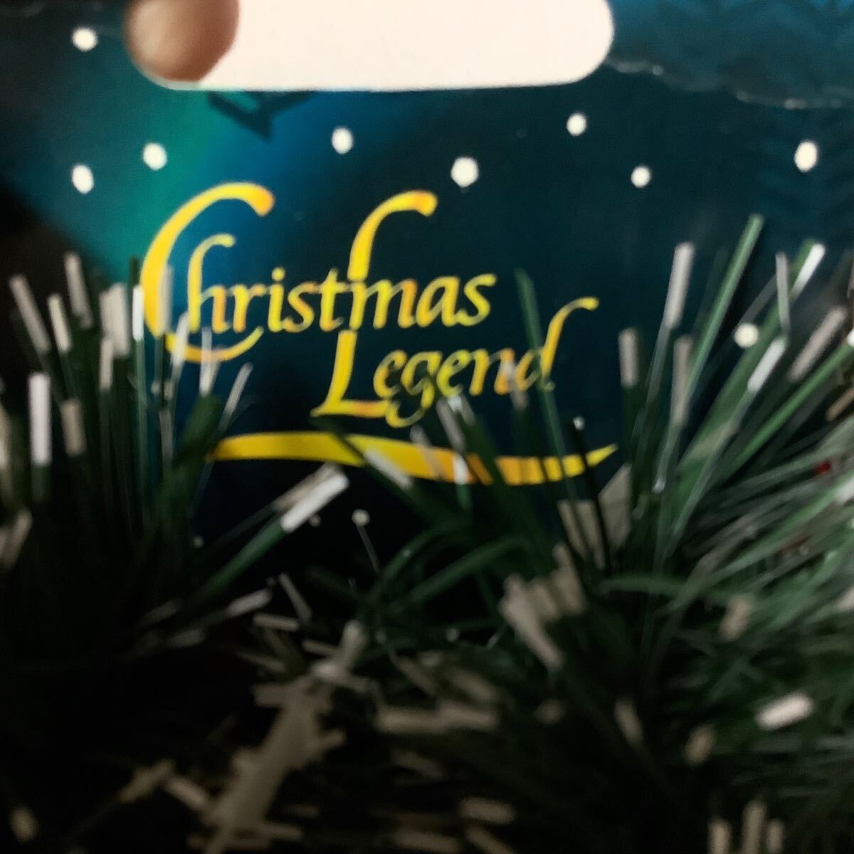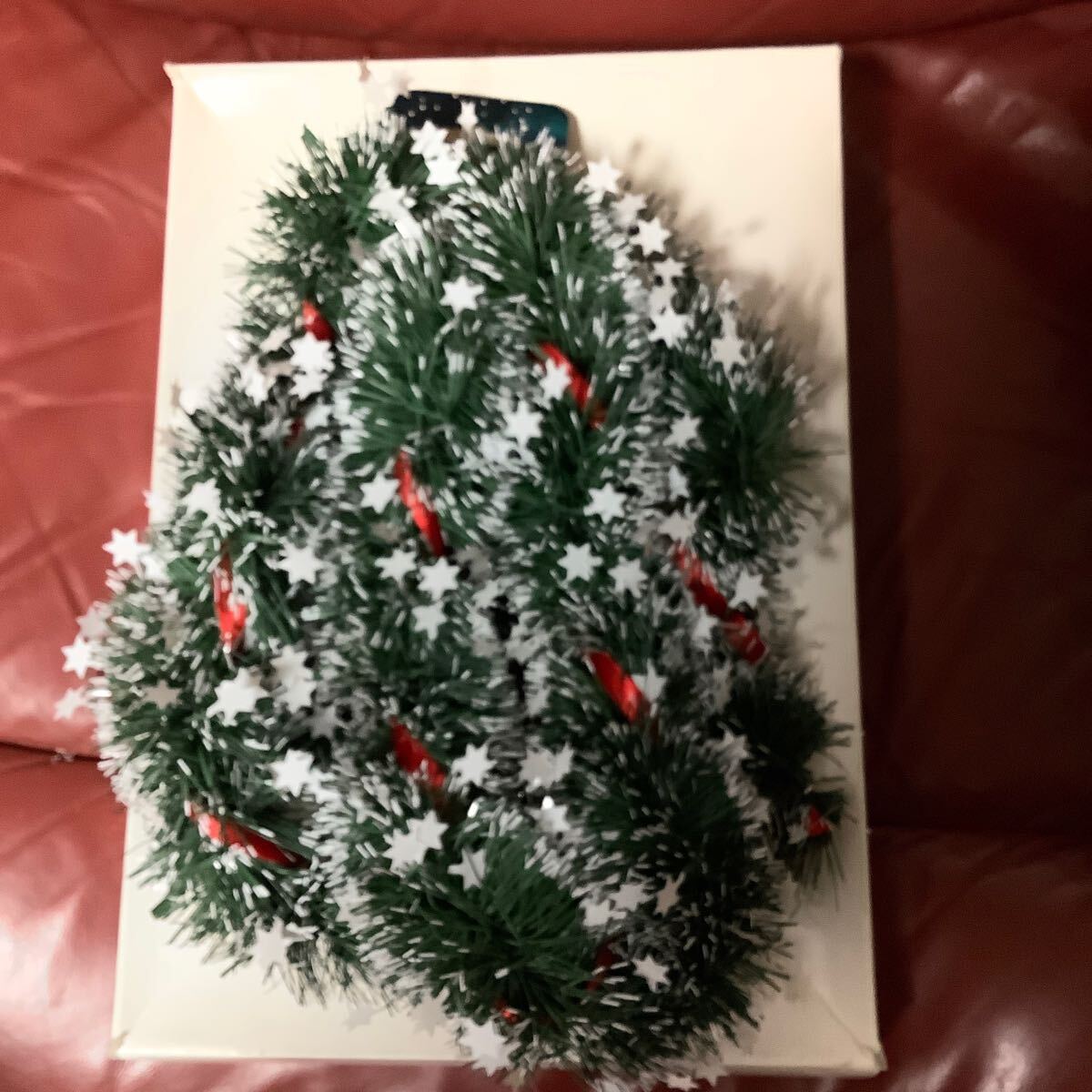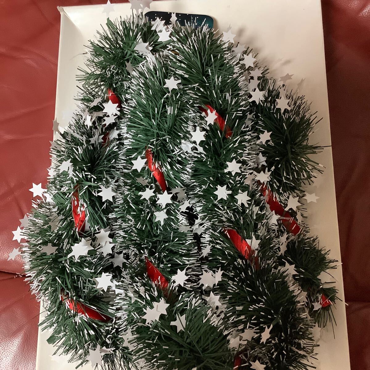 ◯ 緑のモールに赤いリボンが斜めに巻き付けられており、白いお星様が散らばって付いてます。