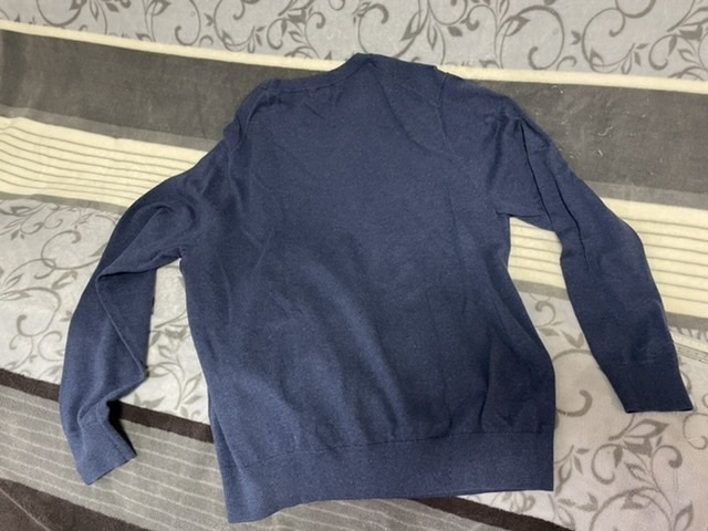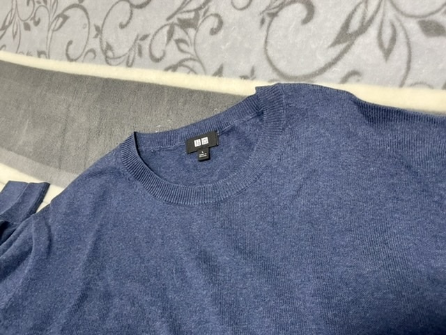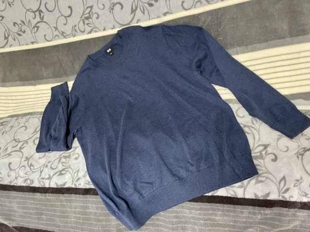 【商品の説明】ユニクロの青の薄手丸首ニット。Lサイズ。