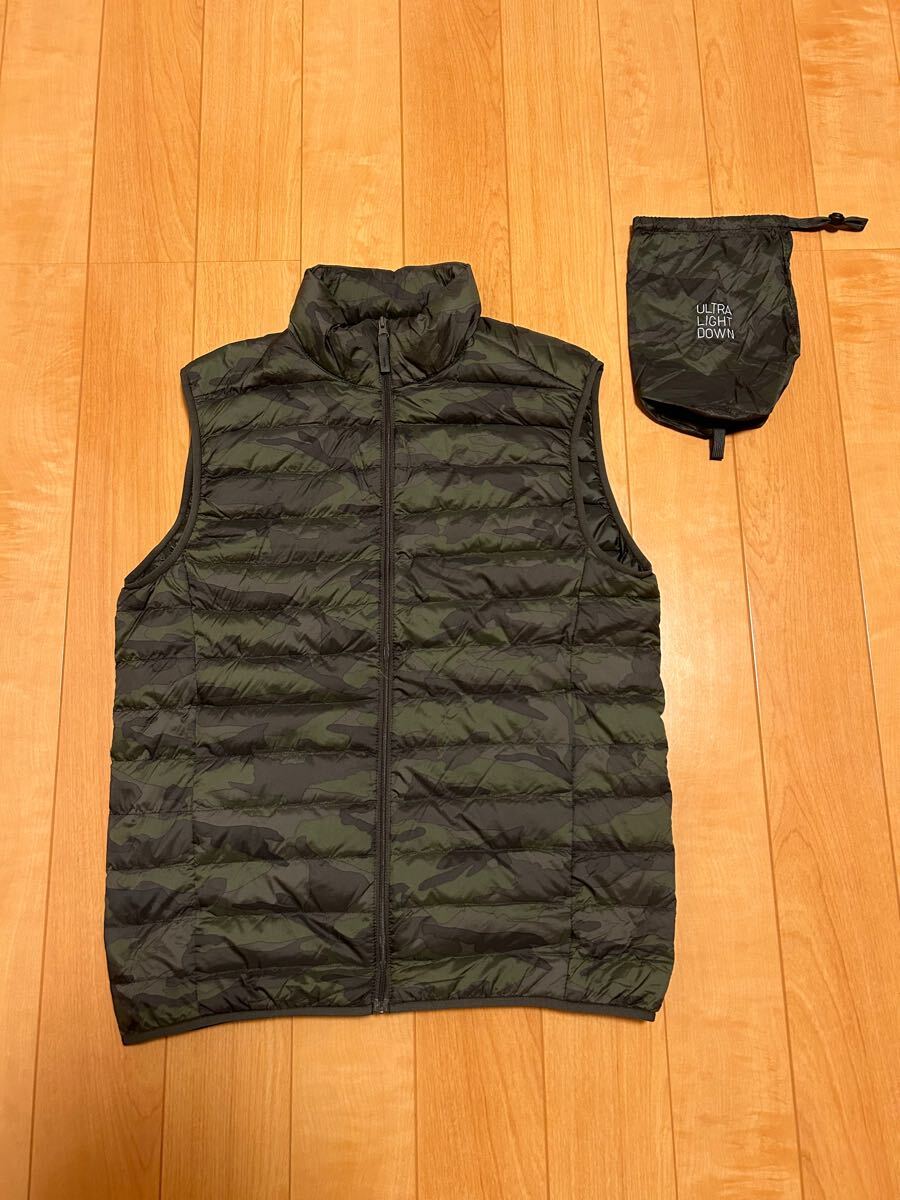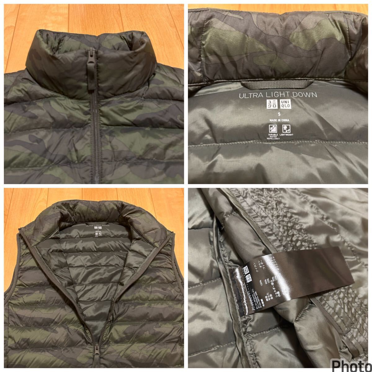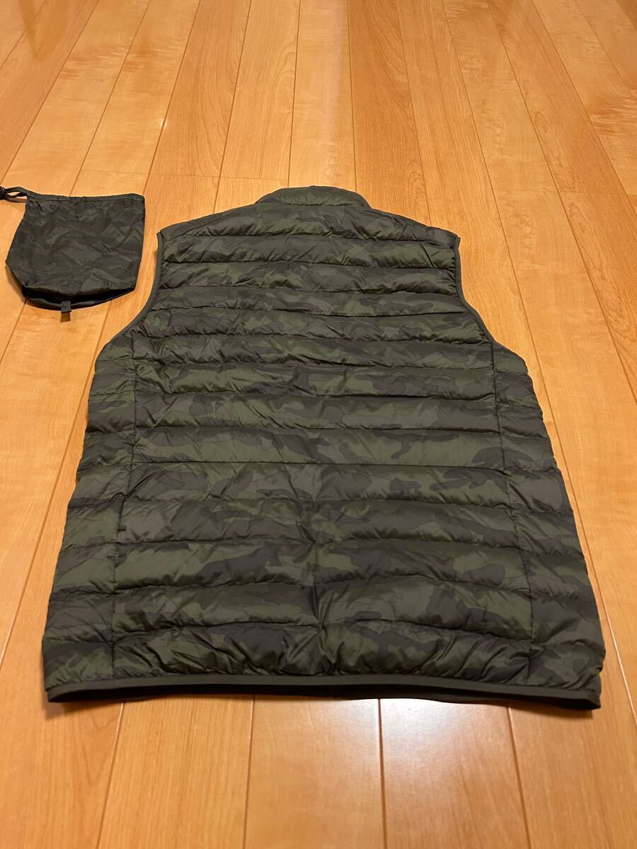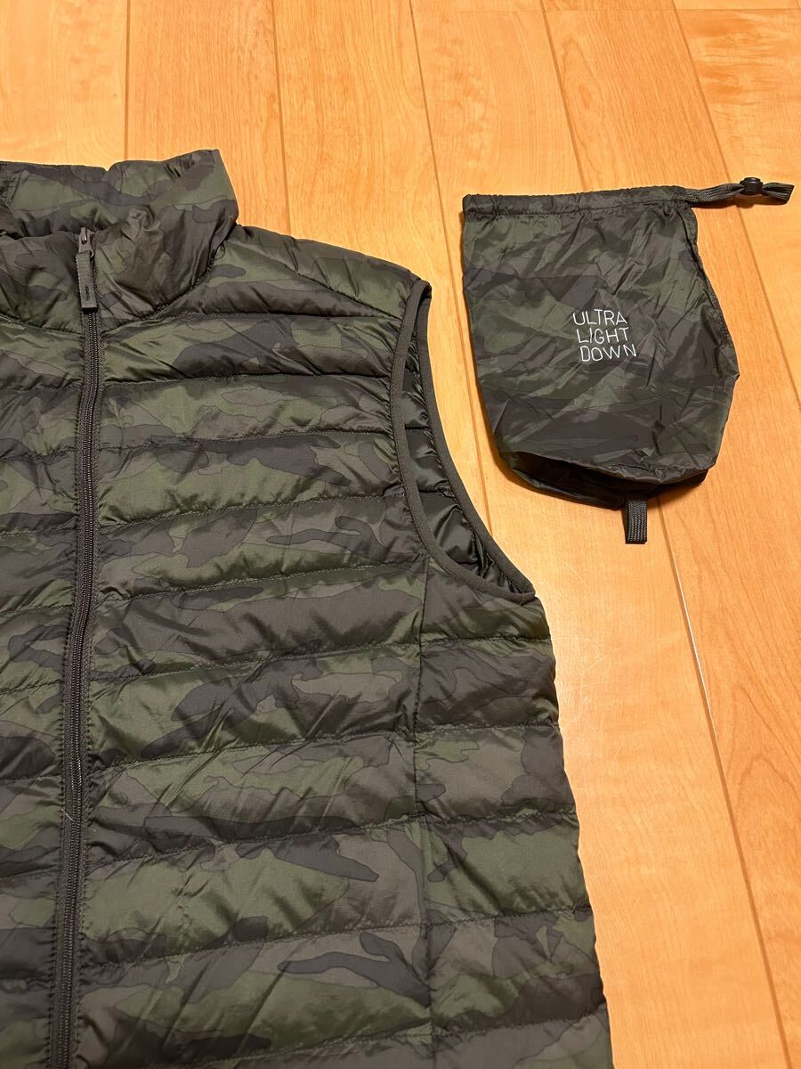美品☆ユニクロ メンズサイズS 超軽量&高密度ウルトラライトダウンベスト 収納袋付・希少.迷彩総柄! キルティングナイロン