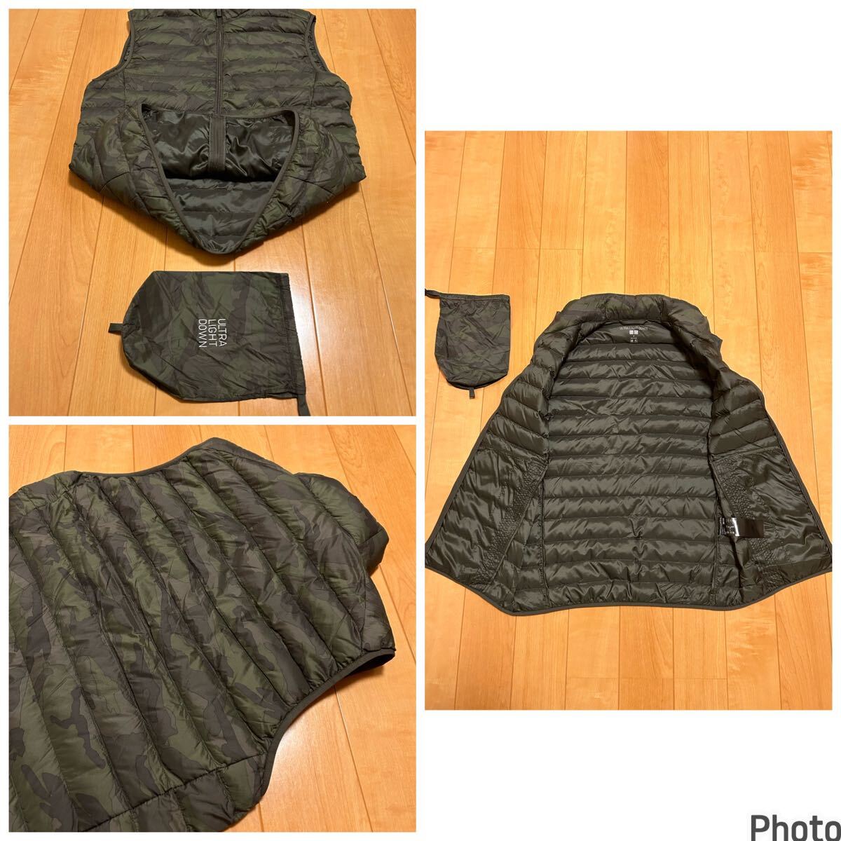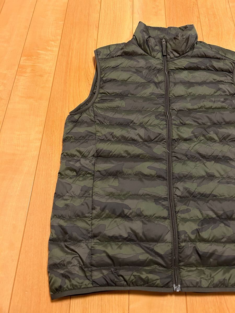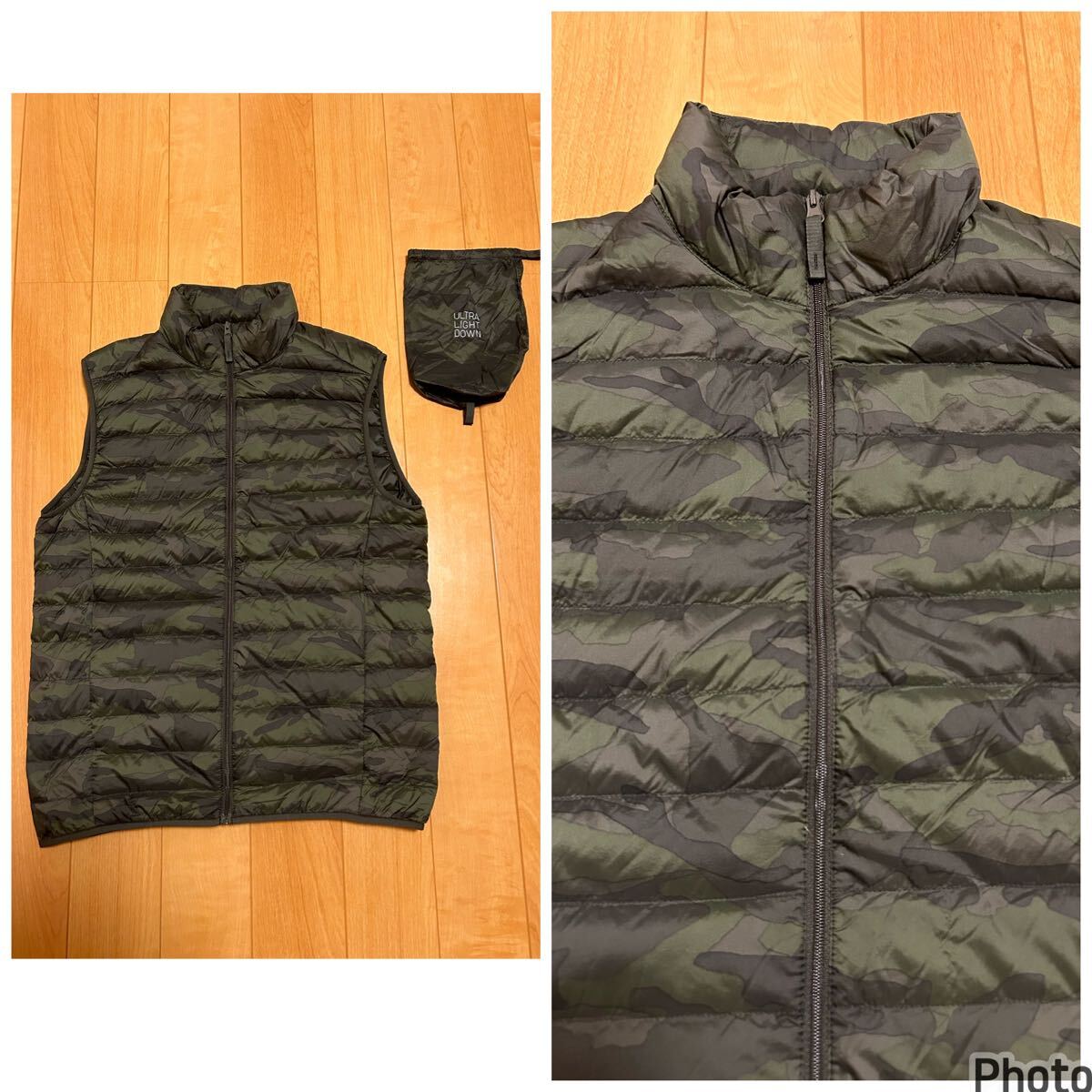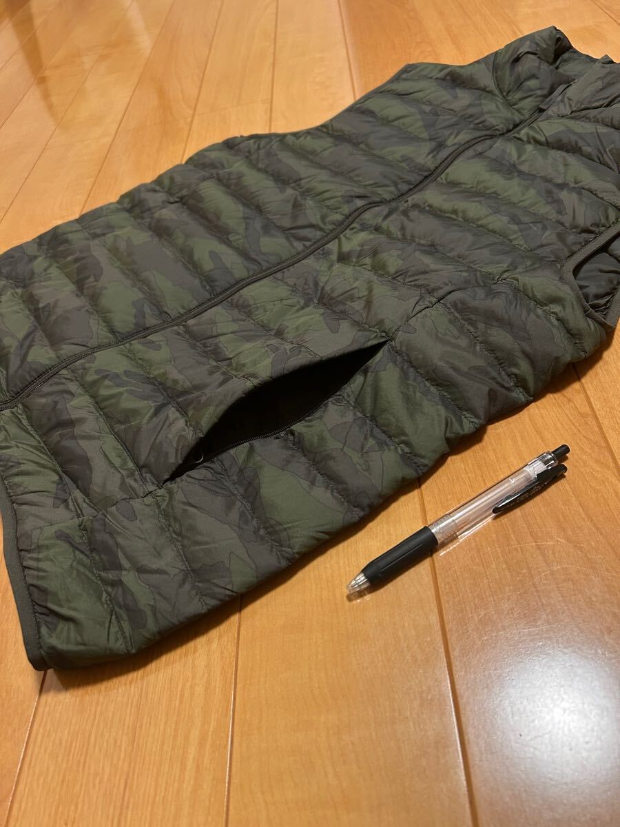 美品☆ユニクロ メンズサイズS 超軽量&高密度ウルトラライトダウンベスト 収納袋付・希少.迷彩総柄! キルティングナイロン