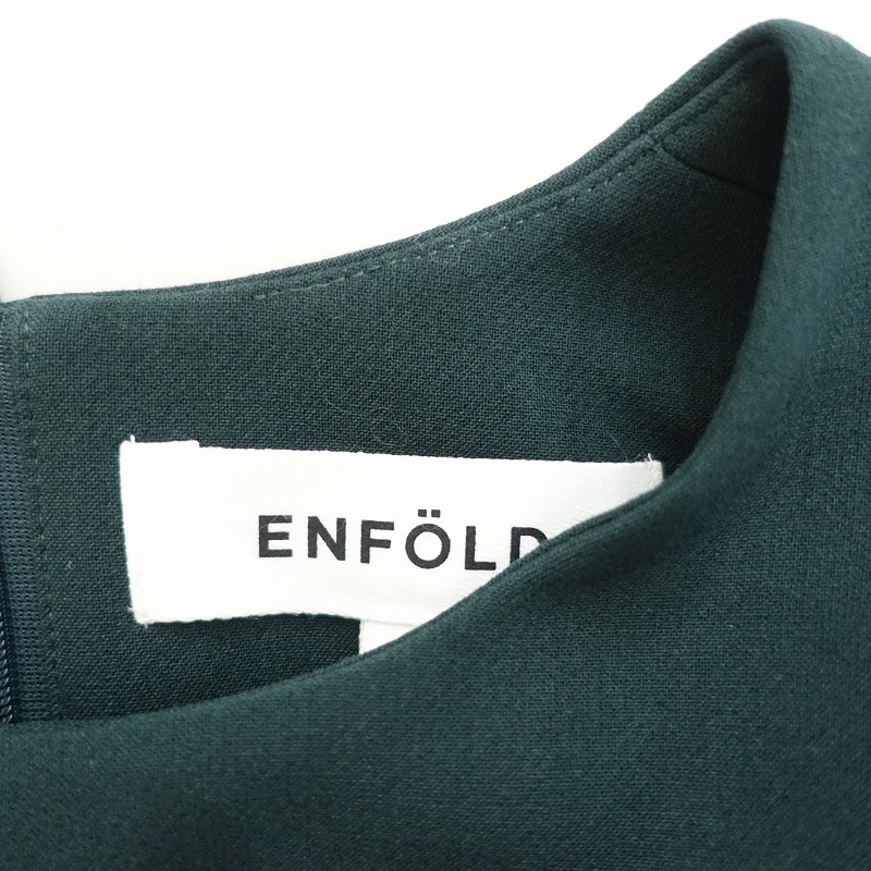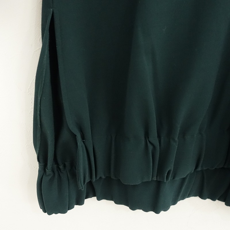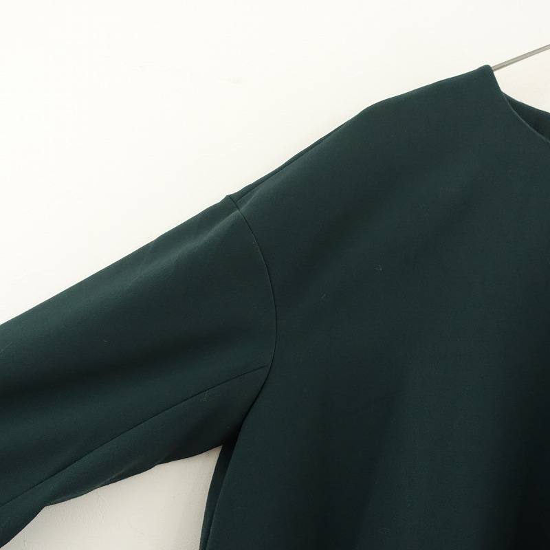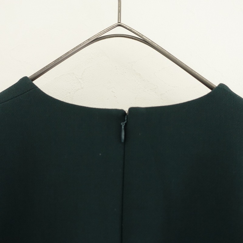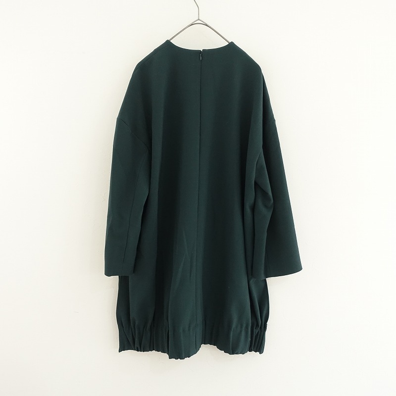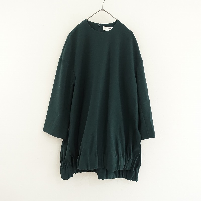 | ENFOLDのバルーンチュニックワンピースです。カラーはダークグリーンで、ストレッチのある程よい厚みの生地で仕立てられております。裾はゴム入りになったバルーン風デザインで、バックファスナー半開で着脱できます。両裾に大きなスリット入り、着丈はフロント側が少し短くなっております。 |