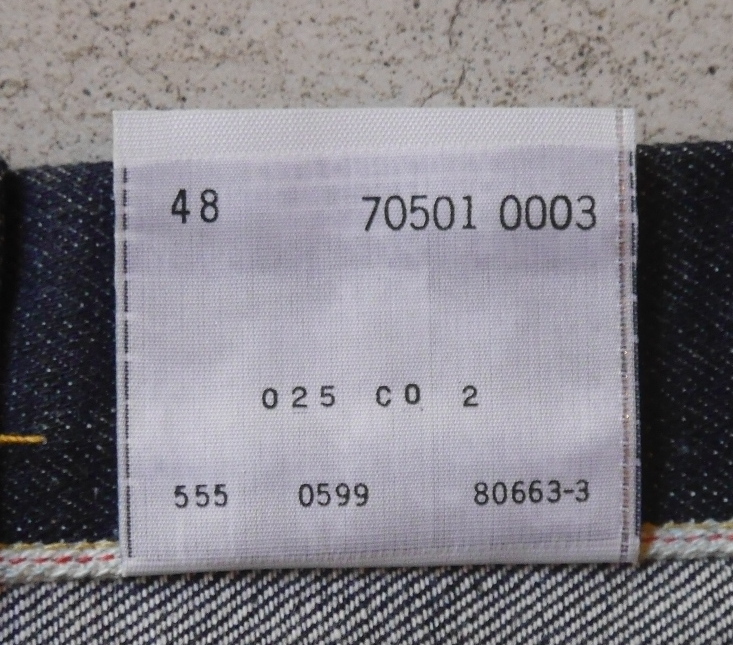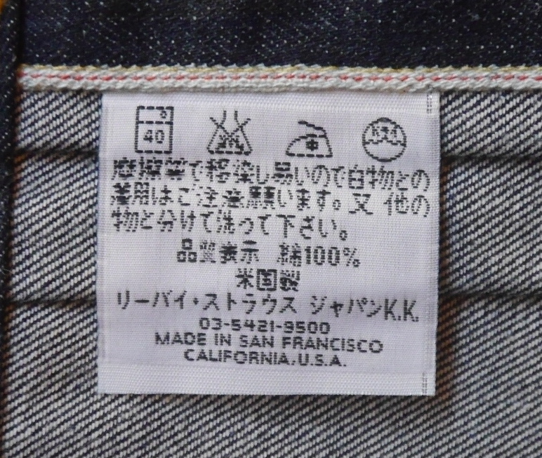 内側の白タグ表記が0599なので1999年5月にリーバイス自社工場のバレンシア工場で生産された商品と確認できます。