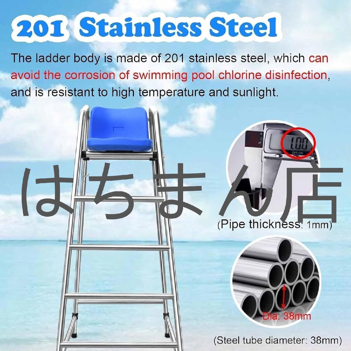【304ステンレス鋼】:当社のライフガードチェアは304ステンレス鋼フレームを採用しており、鋼管の直径は3.8cm/1.5インチ、厚さは1mm/0.04インチ、耐荷重は300kg/660ポンドです。