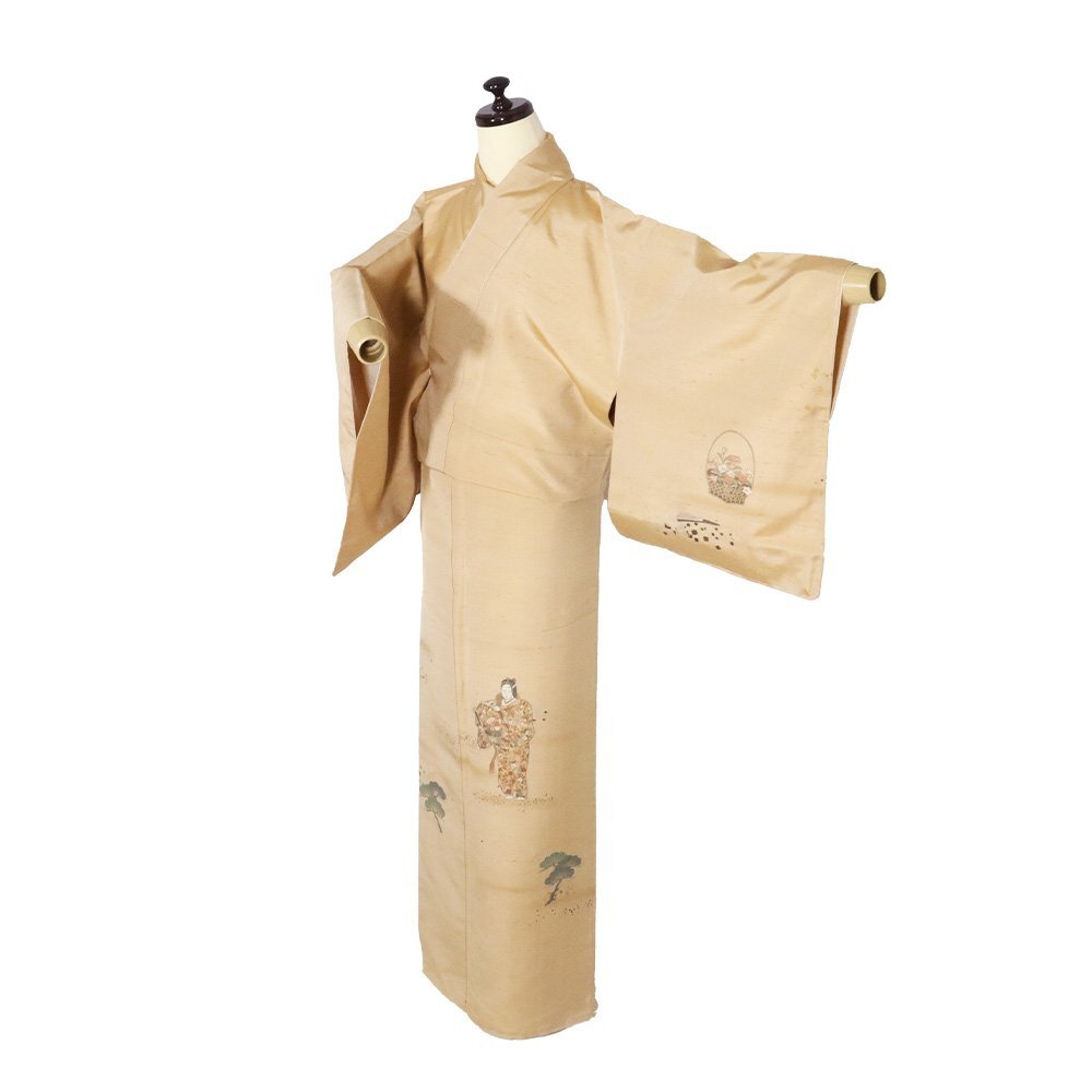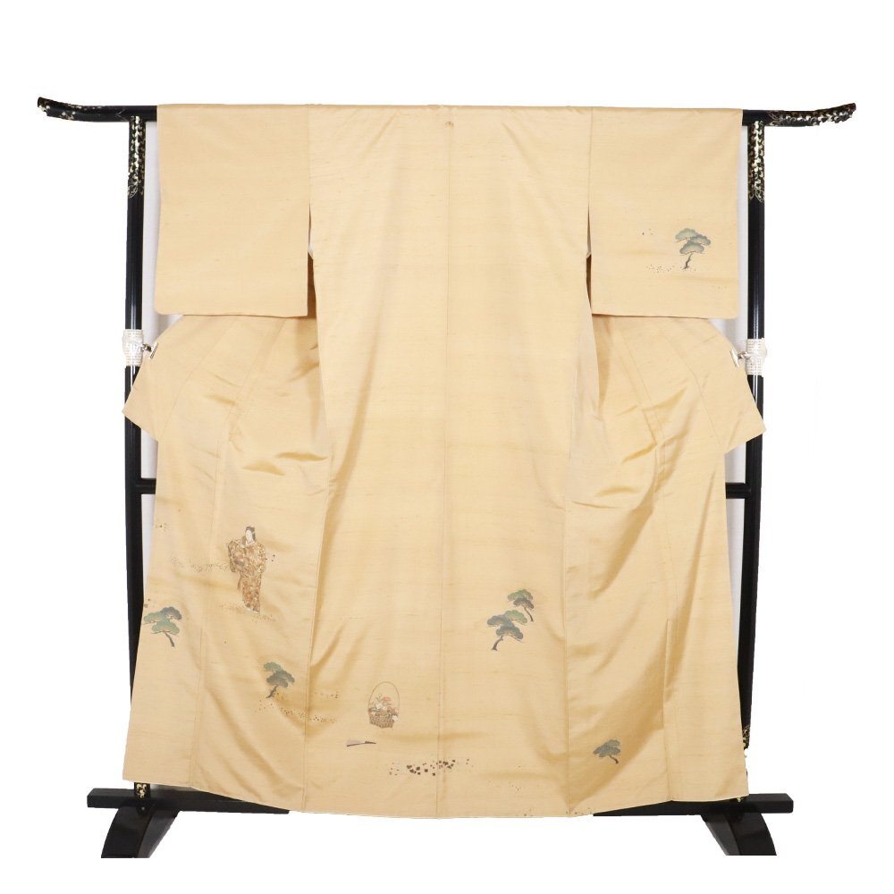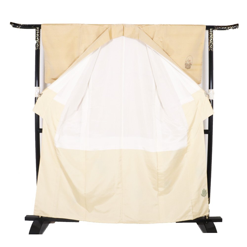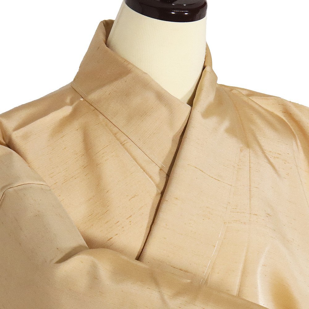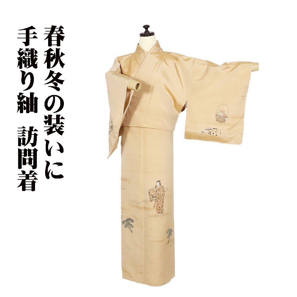 | 手織り紬 訪問着 袷 芥子色(芥子色)地 能・花籠・織柄 金箔ちらし 166 広襟 一つ紋 未使用品 仕付け付き |