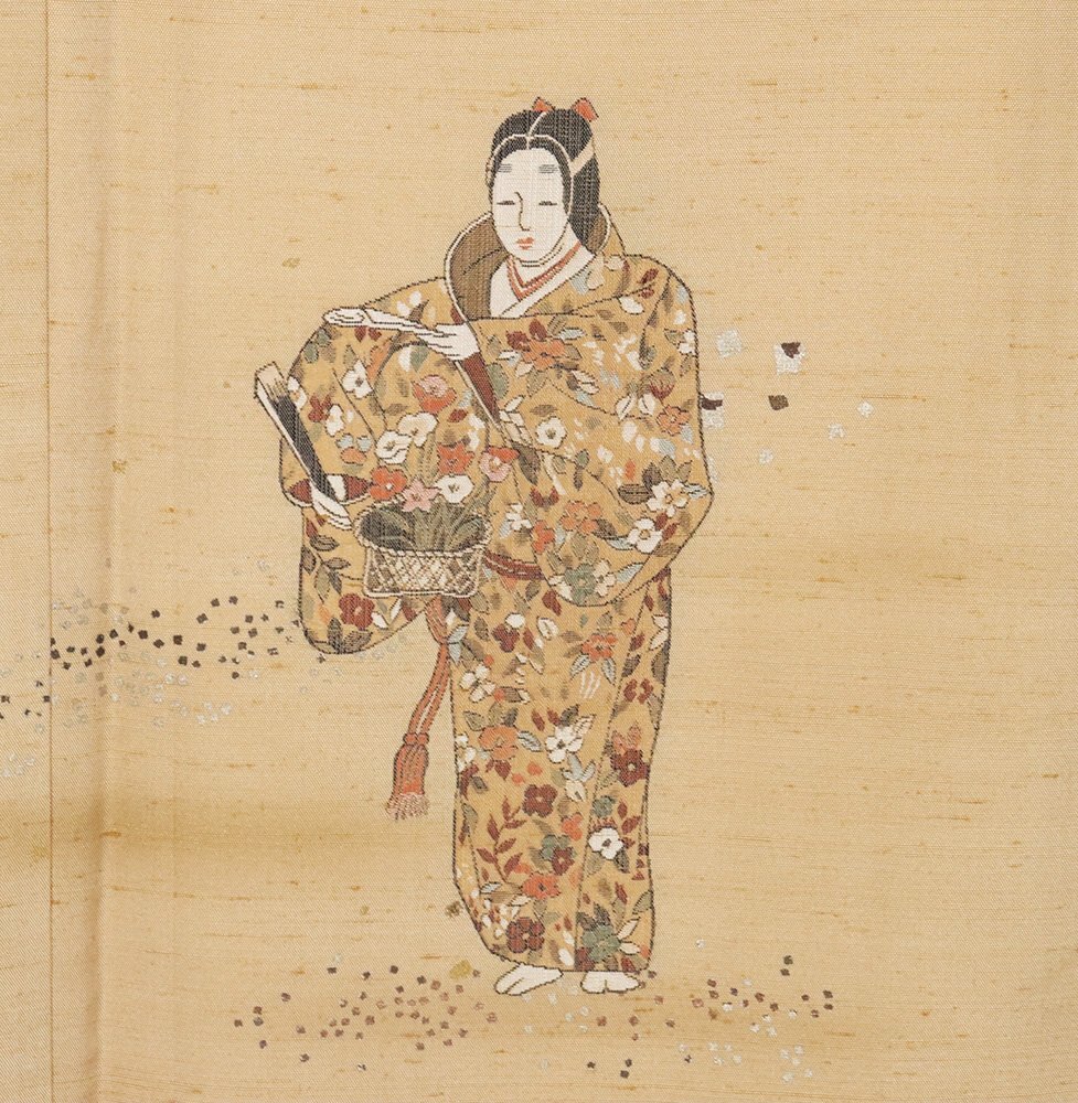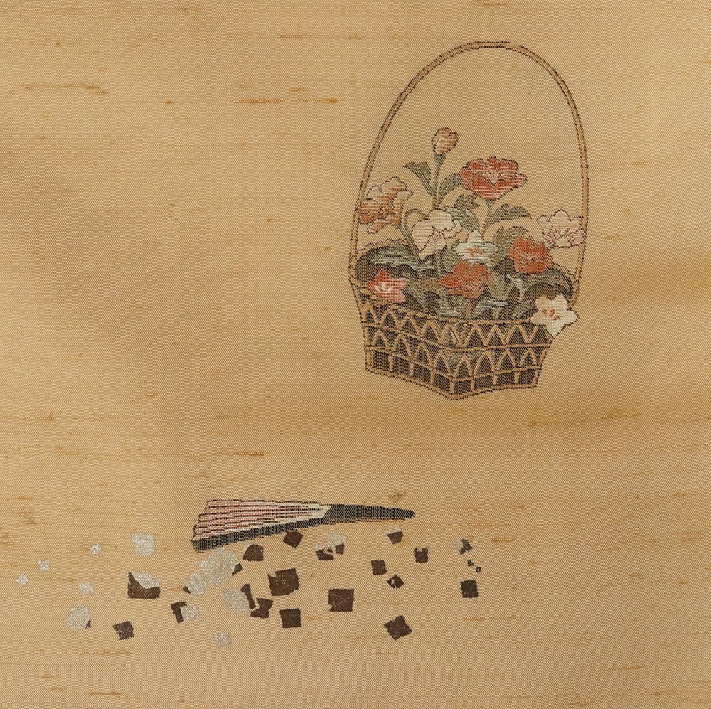 手織り紬 訪問着 袷 芥子色(芥子色)地 能・花籠・織柄 金箔ちらし (写真では上手く色が出ない場合があります。ご了承下さい) |