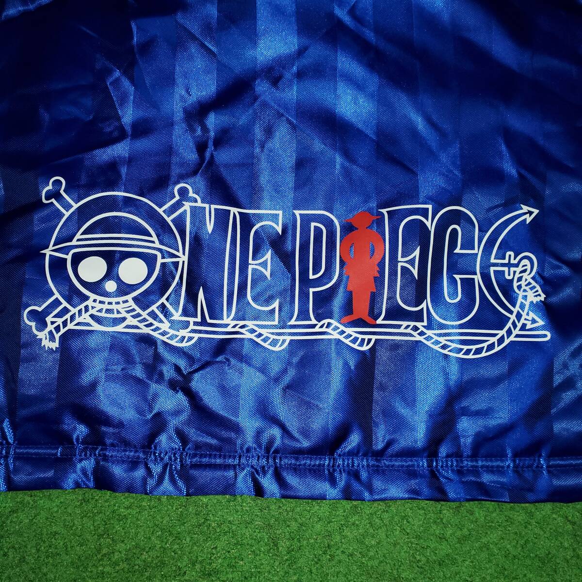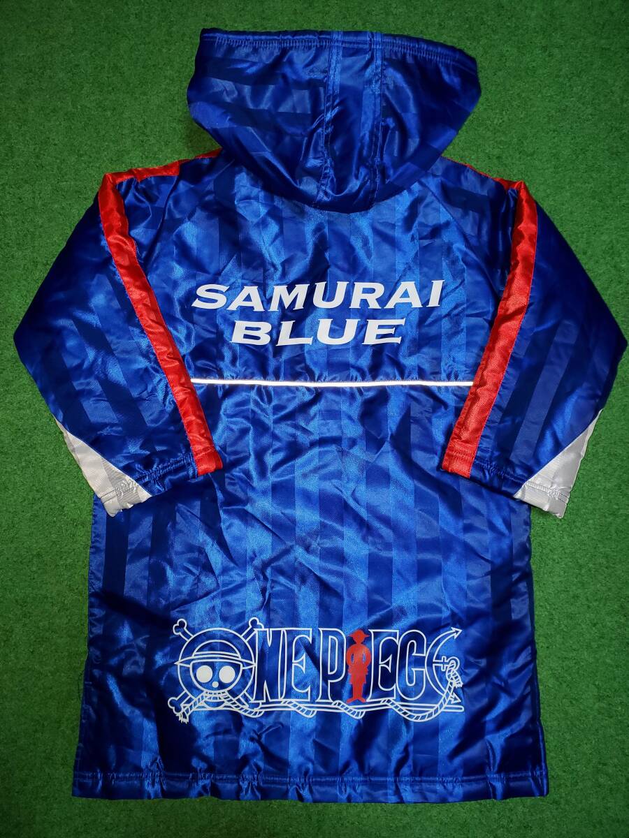 サッカーの日本代表と人気漫画のワンピースのコラボしたベンチコートです。
