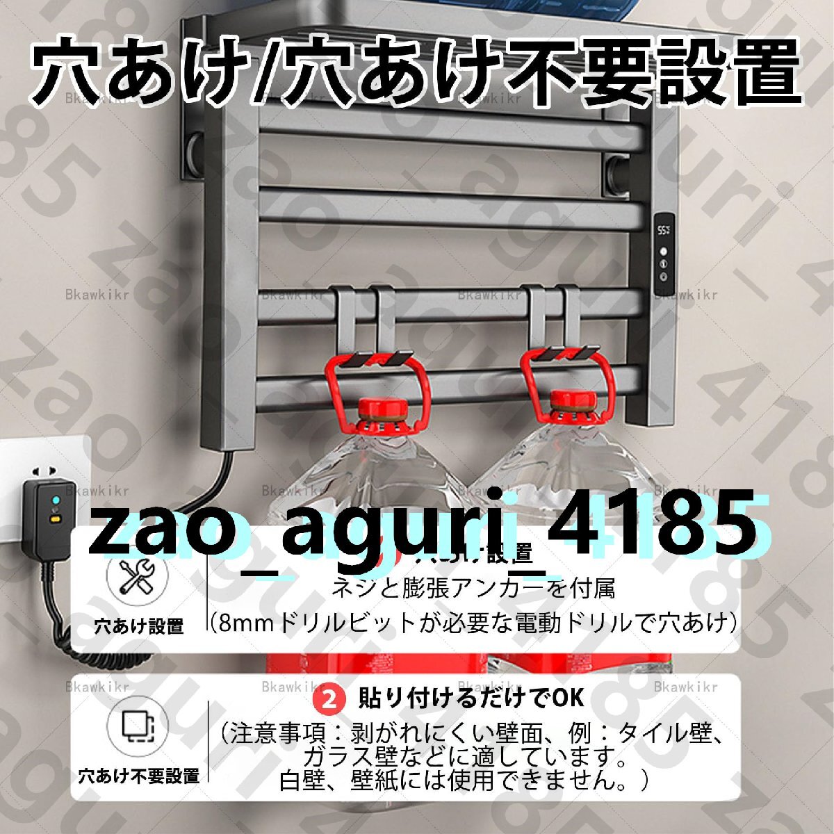 電気タオルウォーマー 壁掛け加熱タオルラック 電気タオル掛け タオルウォーマー 加熱タオルラック 恒温布巾掛け LEDディスプレイ 壁掛け式 浴室 洗面台 ホテル用 家庭用日本仕様プラグ タイマー付き電気壁掛けタオル掛け 電気タオル掛け タオルウォーマー 加熱タオルラック 恒温布巾掛け 電動タオルスタンド 液晶画面 タイマ サーモスタット付き 壁掛け 電動タオルウォーマー90°折り畳みデザイン使用後は簡単に収納でき、省スペース設計。IPX4防水仕様漏電防止で水しぶきにも強く、安全に使用可能。多様な取り付け方法穴あけと接着剤取り付けに対応。強力な耐荷重で壁を傷つけません。LEDタッチスクリーン1~9時間のタイマー機能付きで簡単操作。頑丈で耐久性抜群耐熱防水設計で、さまざまな環境に対応可能。製品パラメータ:名前:電気タオル掛け色: 黒/グレー/白サイズ: サイズ表を参照してくださいパッケージ内容:電気タオル掛け*1注記:1.測定ツールが異なるため、1?3mmの測定誤差はご了承ください。2.モニターや照明効果の違いにより、実際の商品の色は写真の色と多少異なる場合があります。
