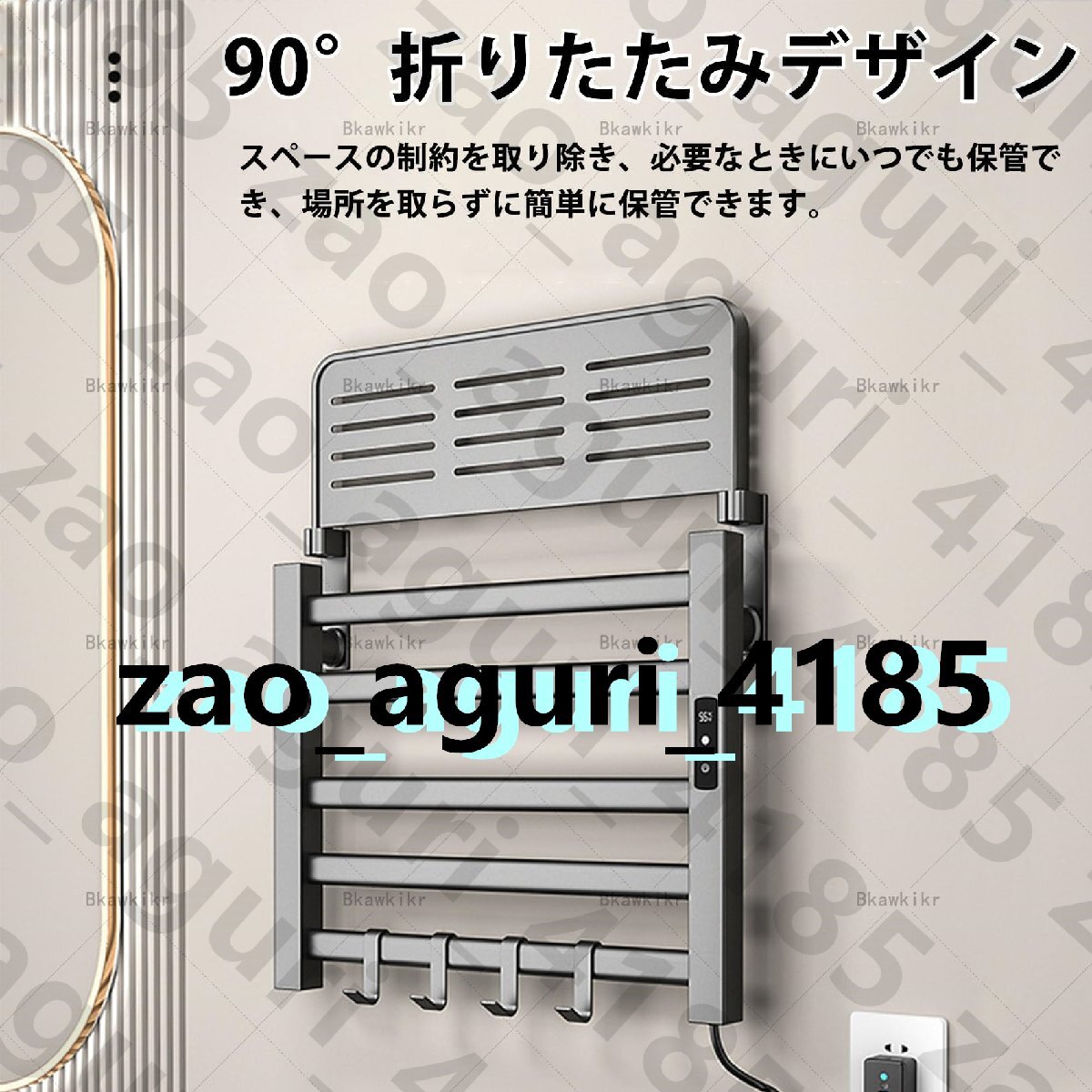 90°折り畳みデザインで使いやすさ抜群、革新的な90°折り畳みデザインで、使用後は簡単に収納でき、場所を取らずに浴室の空間を有効活用できます。電気タオル掛け