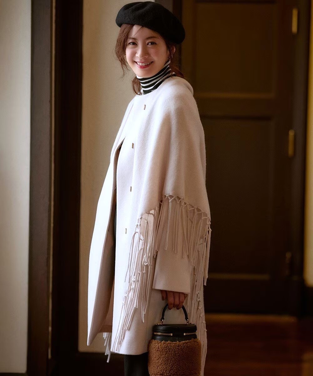 フロントはメタルカラーのホックであけたときの印象も寂しくなり過ぎず、華やかな印象で、様々なシーンで活躍するアウターです。カラーは、柔らかく優しい印象のベージュ(#033)です。