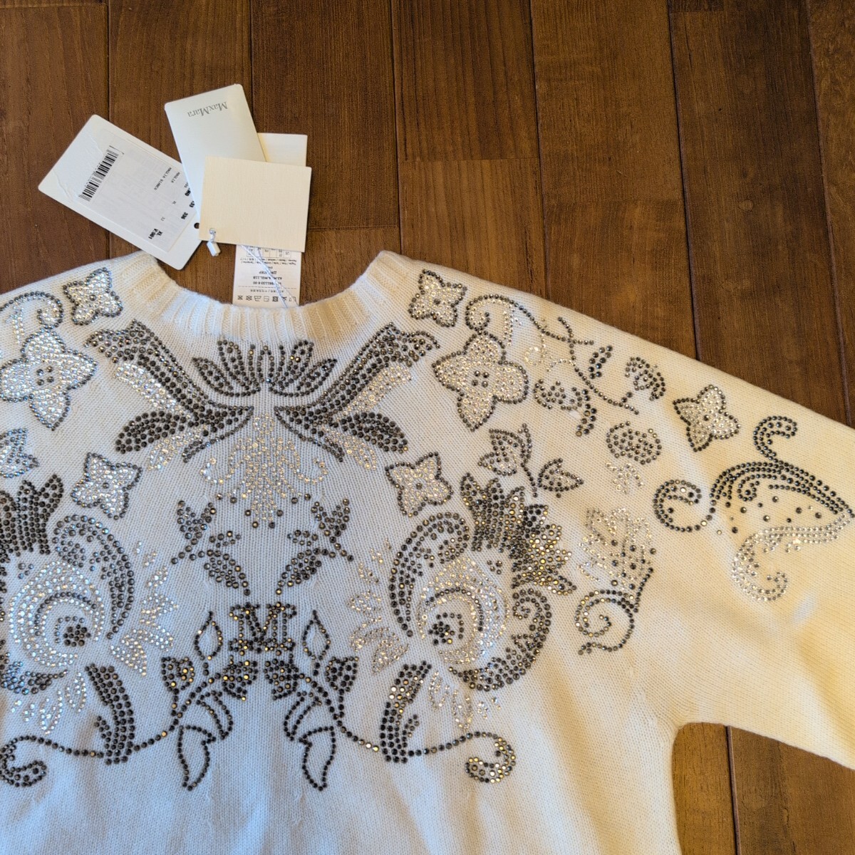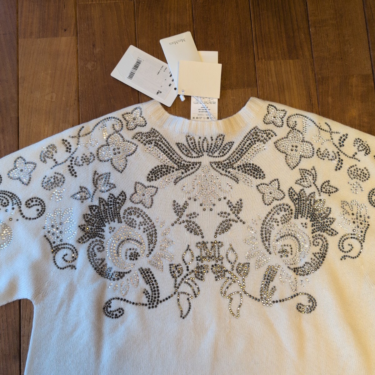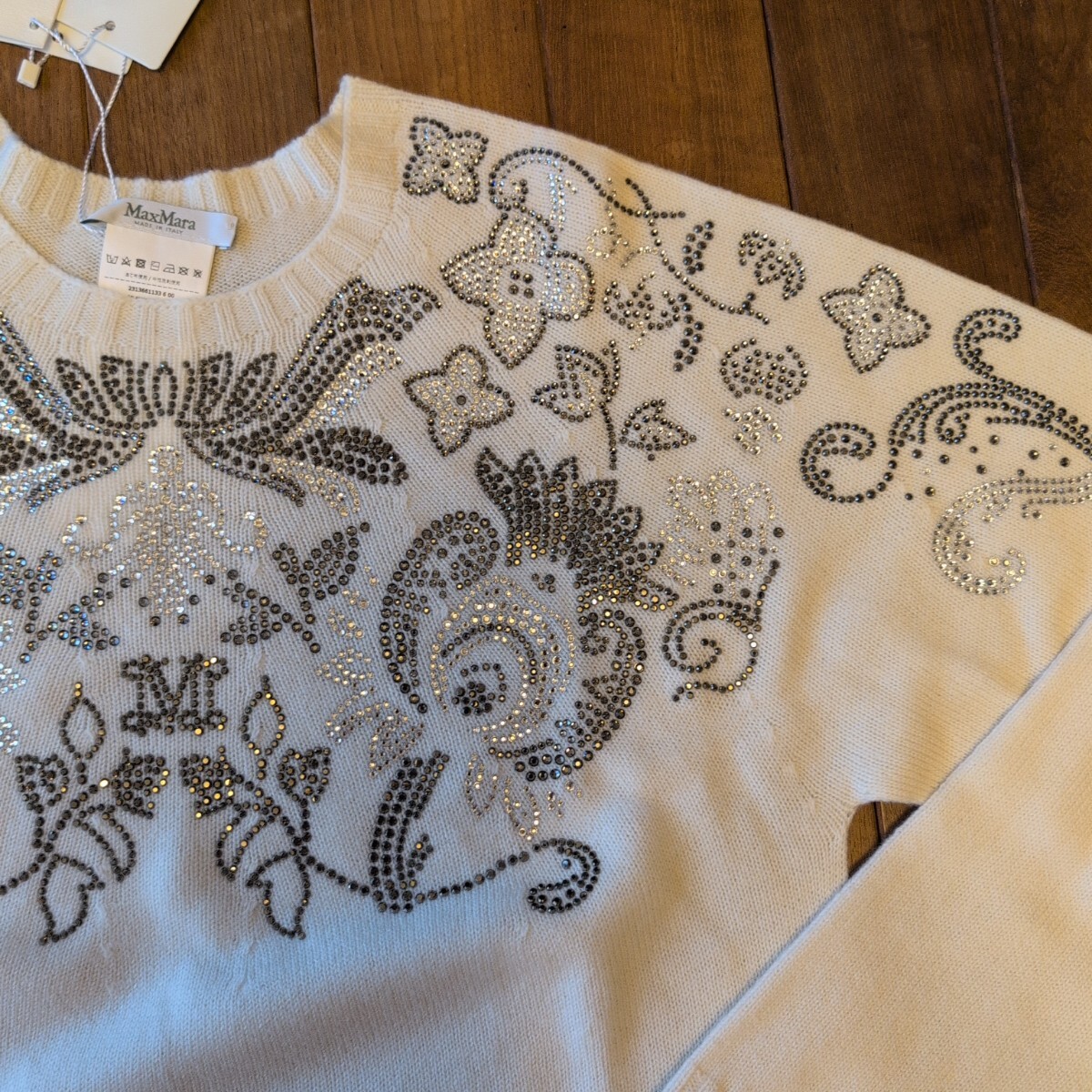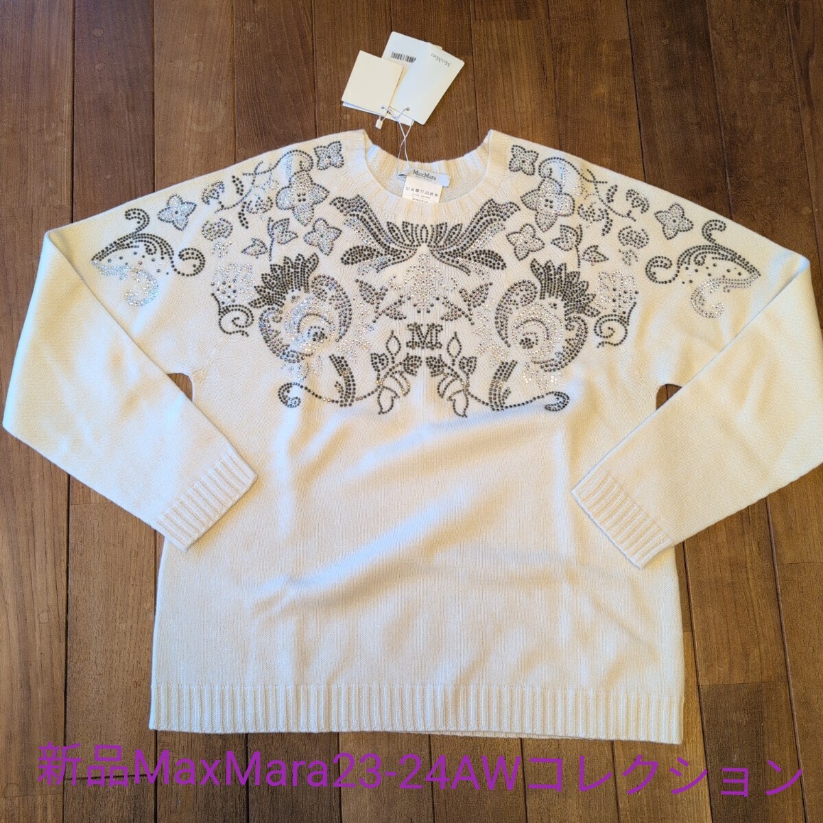 〈新品〉Max Mara 23-24AW秋冬の日本未入荷セーター、カシミヤ30%、ピュアウール70%のLサイズになり、軽くて暖かな上級素材セーターです。白生地に美しいビーズ刺繍が前面背面ともに施された華やかなデザインで、とても目を引く凝った作りで定価は15万になります。