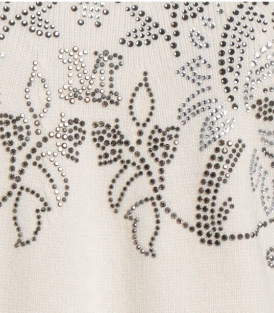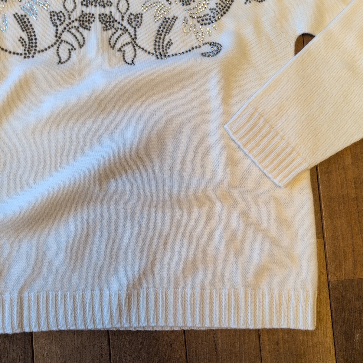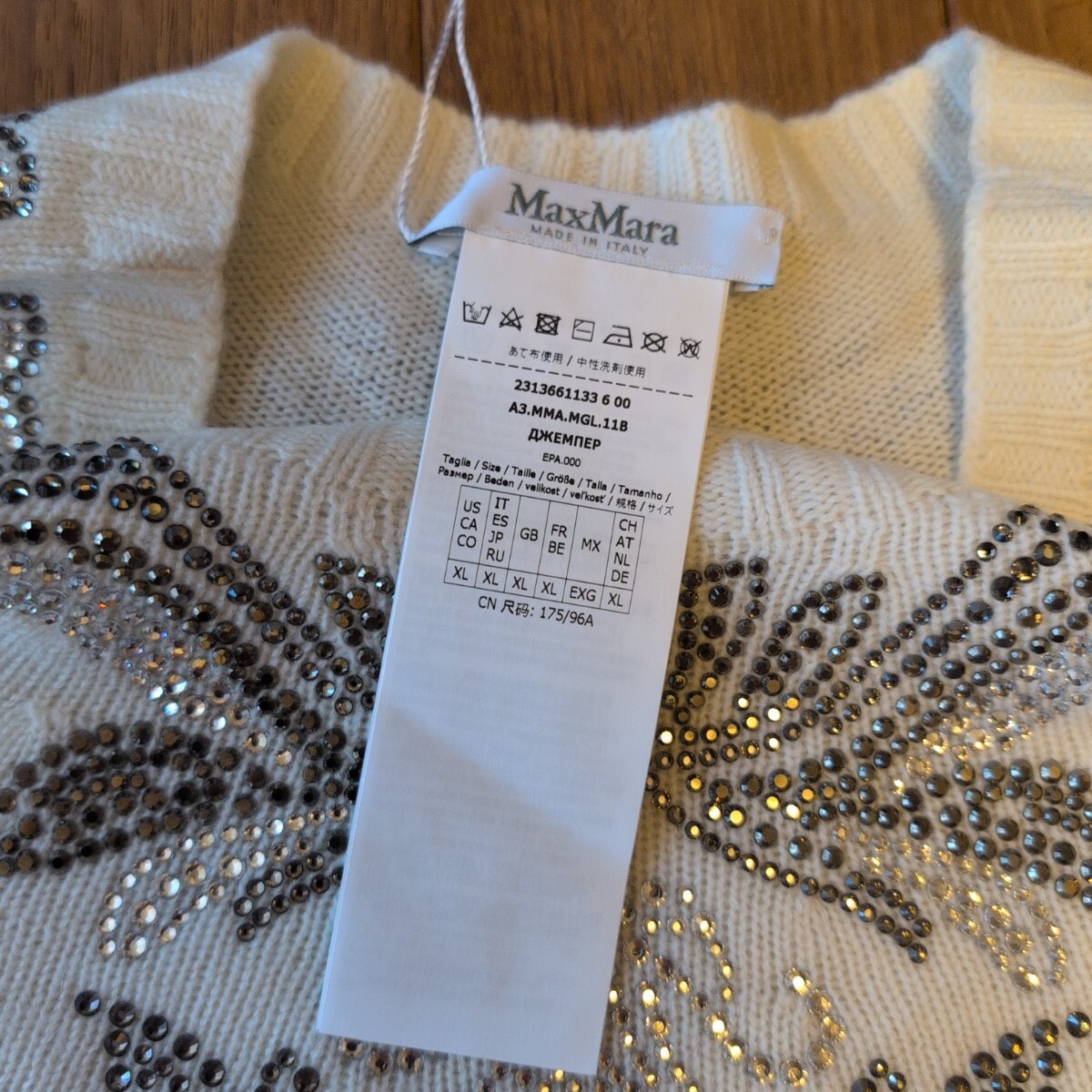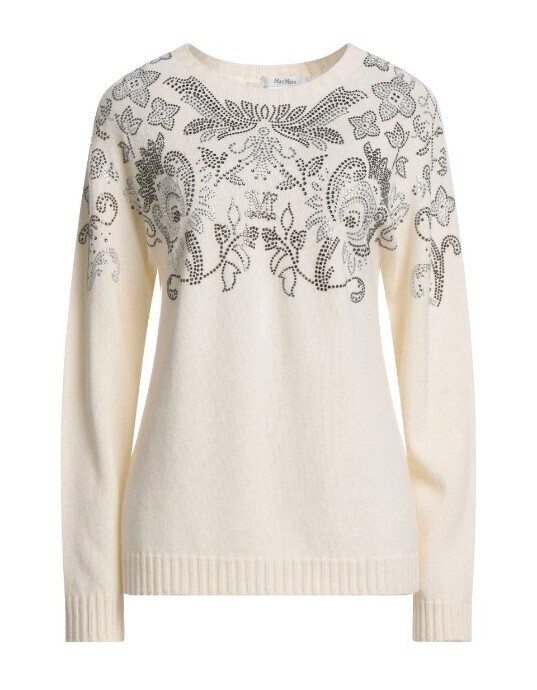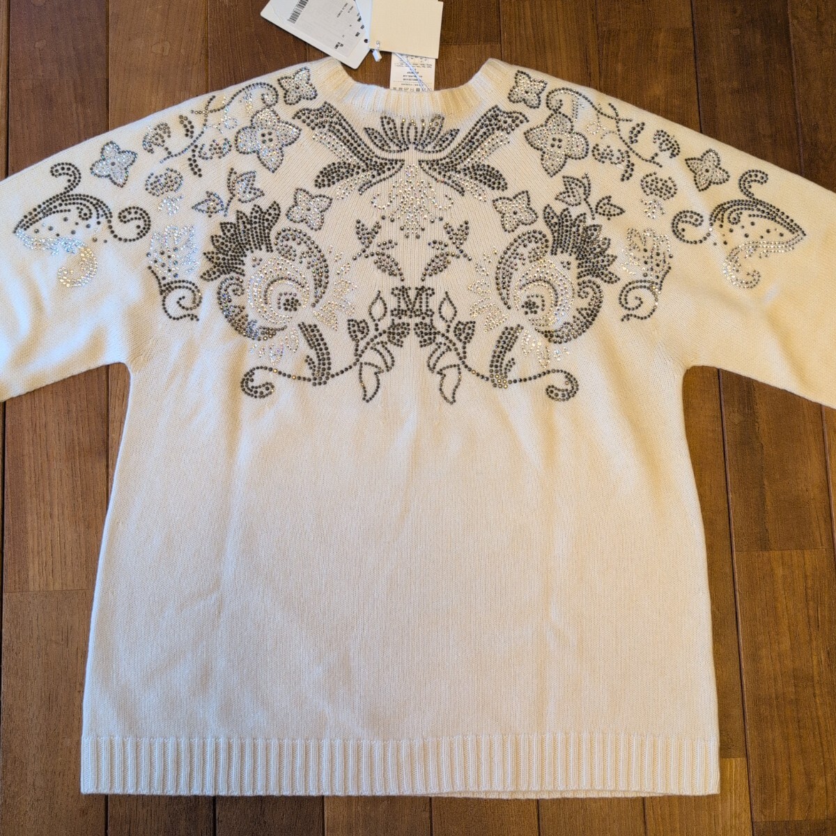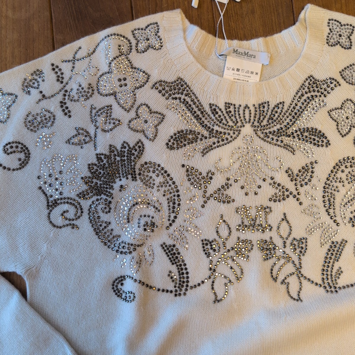 〈新品〉Max Mara 23-24AW秋冬の日本未入荷セーター、カシミヤ30%、ピュアウール70%のLサイズになり、軽くて暖かな上級素材セーターです。白生地に美しいビーズ刺繍が前面背面ともに施された華やかなデザインで、とても目を引く凝った作りで定価は15万になります。