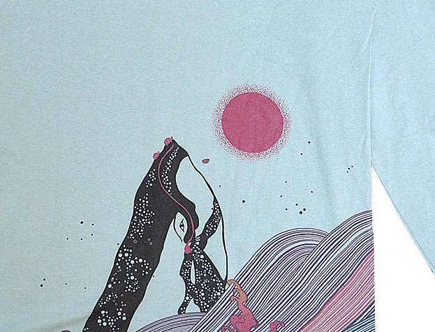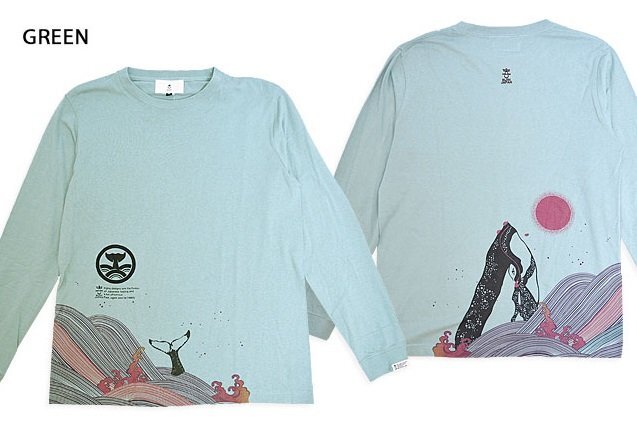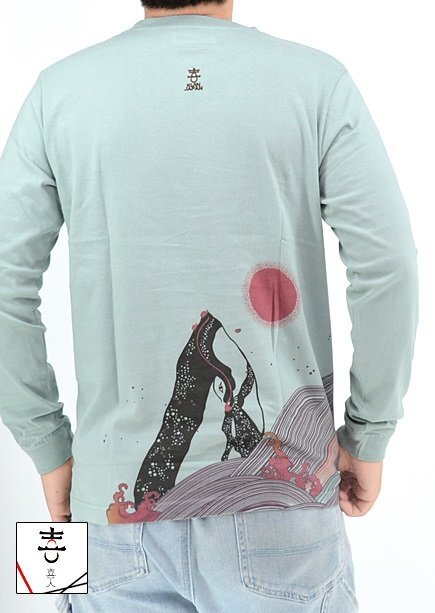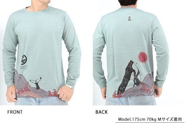 着た人、それを見た人が笑顔になれる、他にはないデザインを提供し続けている「喜人」さんから「クジラのロングTシャツ(KJ-42104)」のご紹介です。 背中には、荒波を優雅に泳ぐクジラを大胆に落とし込みました。 波は幾重にも重なる線で力強く表現。 フロントには去り行くクジラの縁起の良い尾びれが描かれています。 海面から大きく覗いているクジラさんの鼻先には落ちないように必死にしがみついているカメさんが三匹…と思ったら一匹落ちてる! クジラの尾びれ家紋も可愛いですね。 袖には喜人のピスネームが付きます。 脇縫い目がなくストレスフリーな一着です。 | ||||||||||||||||||||