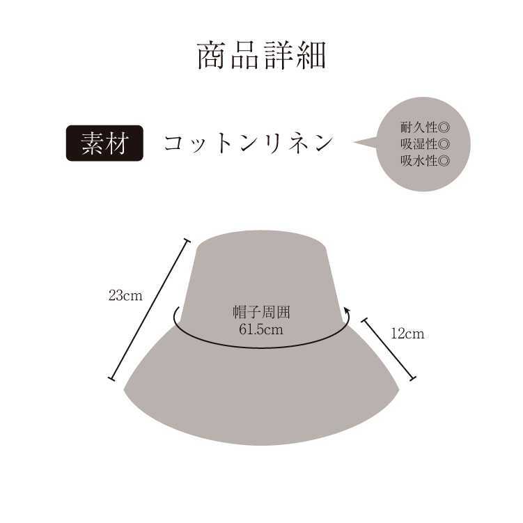 • 【特徴】UV対策とおしゃれさを両立したつば広帽子です。つばが広いので焼けやすい首の後ろまでしっかりガードします。・着脱可能な共布のあご紐が付属しているので風の強い日や自転車に乗るときにも安心です。あご紐にはスライダーが付いているので長さの調整もできます。大きめサイズで頭をすっぽりと覆うので小顔効果も抜群です。どんなファッションにも合わせやすいシンプルデザインと存在感のある大きさでコーデの主役にもなります。つば部分にはワイヤーが入っているので前を折って視界を広げたり綺麗な形をキープもできます。ワイヤーは柔らかいので小さく折りたためて持ち運びにも便利です。気分やコーデによって色を変えられるリバーシブルタイプ4色と裏側も同じ色で統一された単色タイプ4色の計8色からお選びいただけます。お散歩やキャンプなどのアウトドア、ガーデニングや旅行など様々なシーンで活躍します。・コットンリネン素材なので吸水性・放湿性・速乾性・通気性に加え耐久性にも優れています。