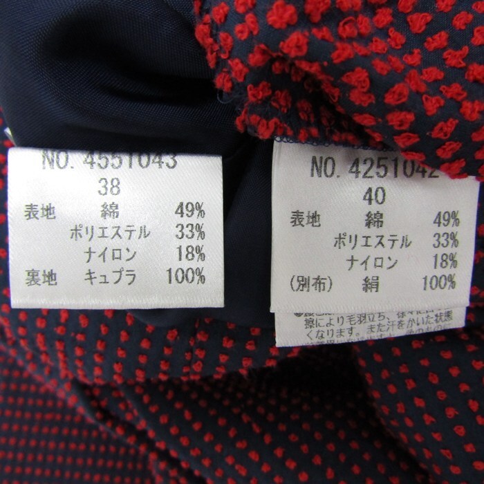 | 商品説明 | ■商品 人気ブランド「チーナ Ci-Na」の厳選したアイテムを出品しております。商品に関しましては、丁寧に検品しております。 ブランド チーナ/Ci-Na 表記サイズ 38サイズ 実寸サイズ 総丈:約57cm 肩幅:約35cm 着丈:約54cm 身幅:約46cm ウエスト:約68cm ヒップ:約53cm カラー ネイビー×レッド (掲載写真でご確認ください) 素材 素材タグを撮影しておりますので、ご確認くださいませ。 対象 レディース 付属品 なし 状態 こちらは未使用のお品となります。 保管に伴う多少のダメージはご了承下さいませ。 状態追記 ジャケット(サイズ40)、スカート(サイズ38) |