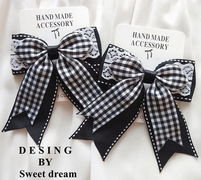 【新品・国内発送】ギンガムチェックとステッチのリボンヘアクリップ(黒)2個セット 64024