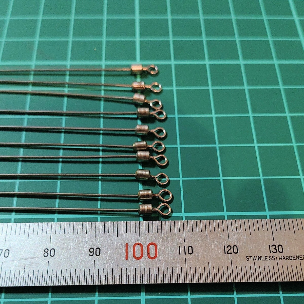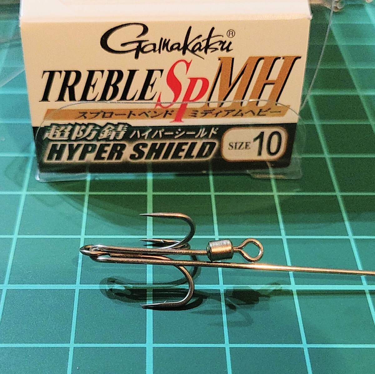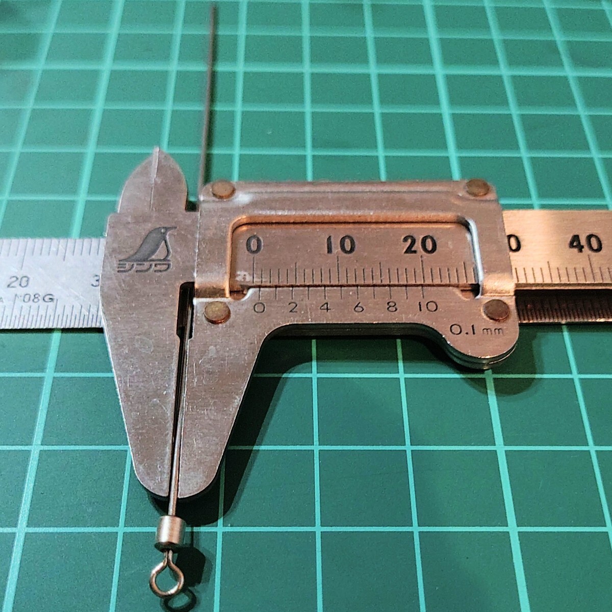 線径1mmのシャフトスイベルだと#8〜#10のトレブルフックで余裕が無くなりますが、0.8mmだと加工しやすくゲイブ幅・アイの有効幅が確保できます。サイズ感は画像ご参照ください。