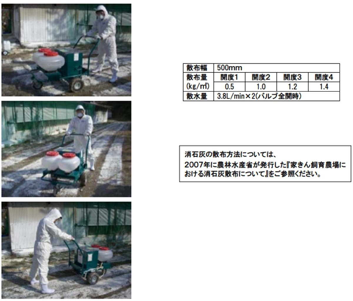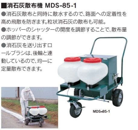 ・消石灰散布の前後に散水ノズルより水を散布することで、飛散を低減し 路面への定着性を高めます。 ・散布高さは地上高80cmと低くドリフトを低減します。 ・消石灰を送り出すロールブラシは、後輪と連動しているので、歩行速度によらず均一で定量散布が可能です。 ・消石灰ホッパーのシャッターの開度を調節するこで、散布量の調節が行えます。 ・粒状消石灰の散布も可能です。 ・散水量は、ボールバルブで調節が可能です。 ・ライトバンに搭載できるコンパクトな設計です。仕 様 形 式 :MDS-85 寸法(長×幅×高) :1215×775×805~1020mm 質 量 :44kg 輪 距 :675mm(後輪部) 消石灰ホッパー :約 85L(消石灰 60kg相当) 散水タンク容量 :23L×2※家畜舎内外への消石灰散布作業の省力化・効率化を目的に開発した散布機です。※消石灰散布と同時に散水するので、路面への定着性を高め飛散も防ぎます。※均一で定量散布ができ、経費節減にも繋がります。