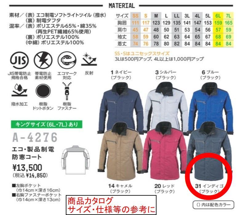 メーカー小売り希望価格:14,850円(税込) こちらの商品は、在庫があれば複数枚組が可能です。 1枚につき+1,500円で対応いたします。 ご希望の方は質問欄から、色とサイズをお問い合わせください。 在庫がありましたら、再出品いたします。 1枚組を落札後に、複数枚組への変更は出来ませんのでご注意ください。 メーカー:コーコス 商品コード:A-4276 商品名:防寒コート 季節:冬 使用素材: 表:エコ静電ソフトライトツイル(撥水) 裏:静電タフタ 混率: 表:ポリエステル65%・綿35% 裏:ポリエステル100% 中綿:ポリエステル100% 備考:色・サイズは出品タイトルで必ずご確認ください。 上記以外の詳細事項に関しては、 メーカーへ問い合わせるか、実店舗でご確認ください 商品の詳細に関してタグ記載事項のみ記載させて頂いております。 股上、裾わたり、裾幅等の質問にはお答え出来ません |