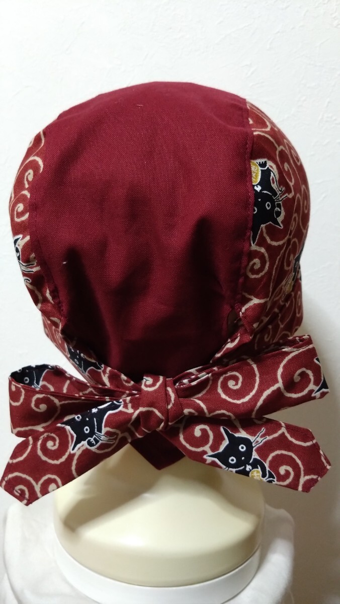 短★バンダナキャップ★ハンドメイド 和柄 唐草×無地 黒ネコ えんじ 赤