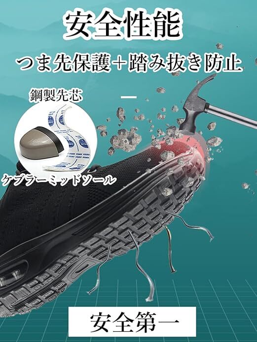 【安全性能】あんぜん靴はJIS H級相当鋼先芯とケブラー繊維ミッドソールを使用します。つま先部分は200Jエネルギーの衝撃を受けることができます。足底部分は1100Nの穿刺力に耐えることができます。足をきちんと守ります。