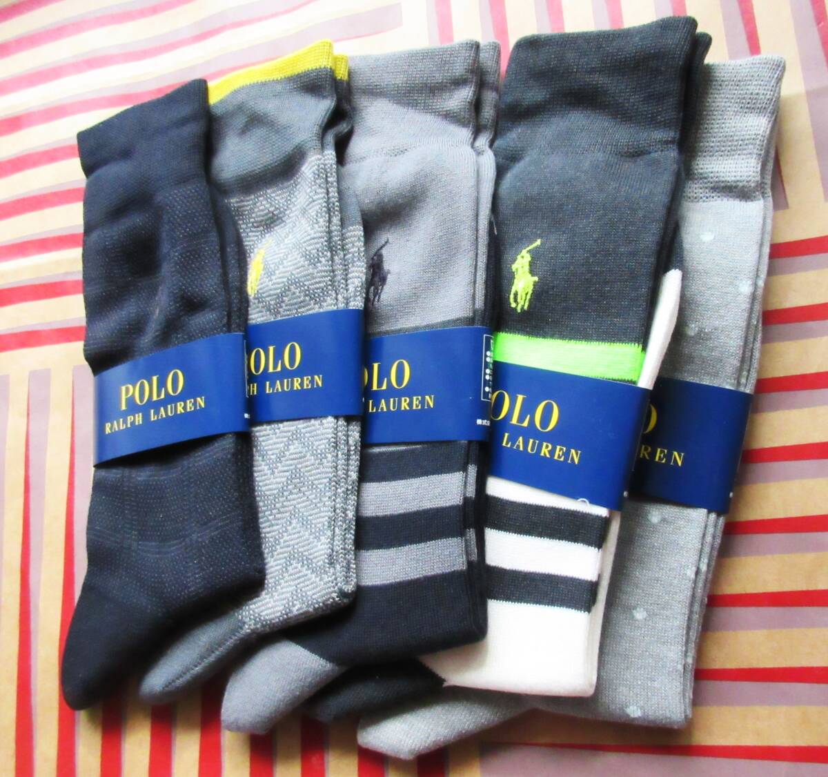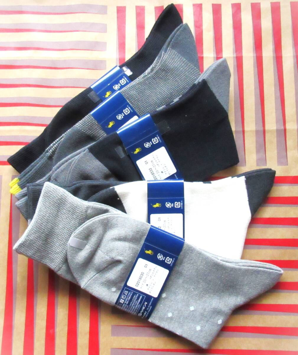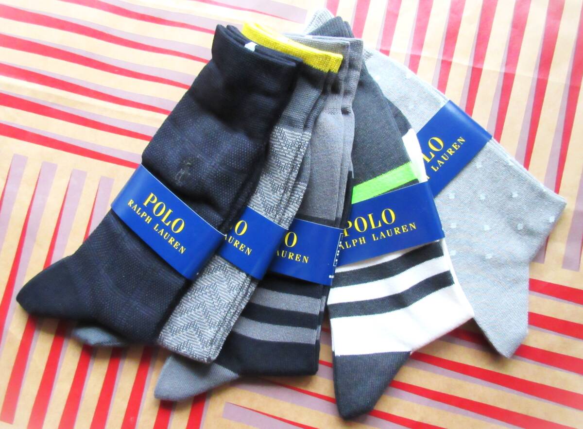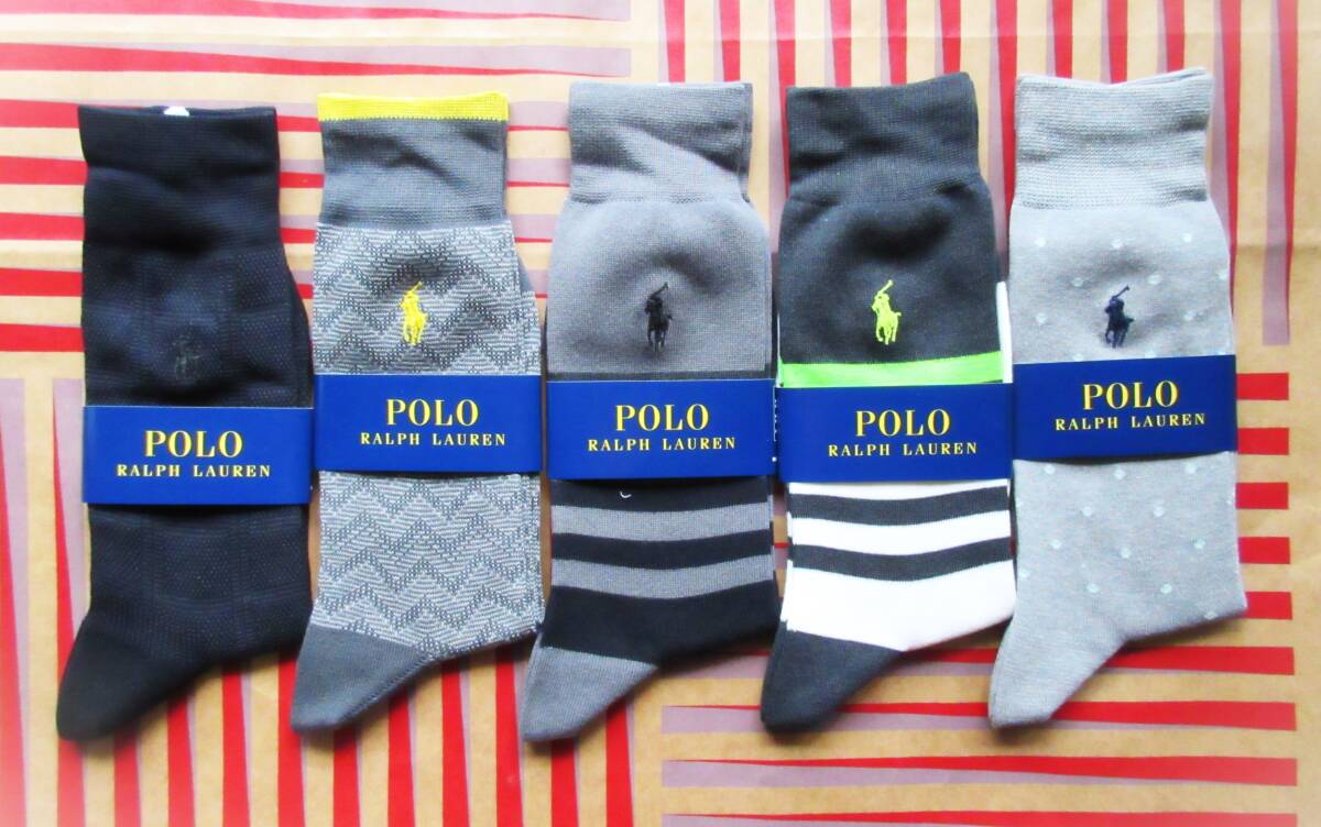 ★★★有名ブランド、ラルフローレンのメンズの未使用新品のカジュアル靴下5足セットです。サイズは標準25(-27)センチです。都内有名デパートで購入してあります。販売定価は5足で7,500円以上です。とてもしっかりとした作りで、とてもお洒落なカジュアルソックスが5足セットで低価格なので、とてもお買い得です。★★★
