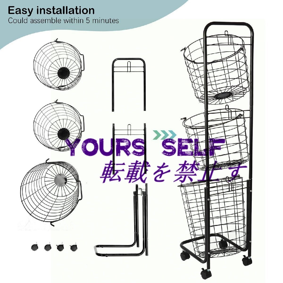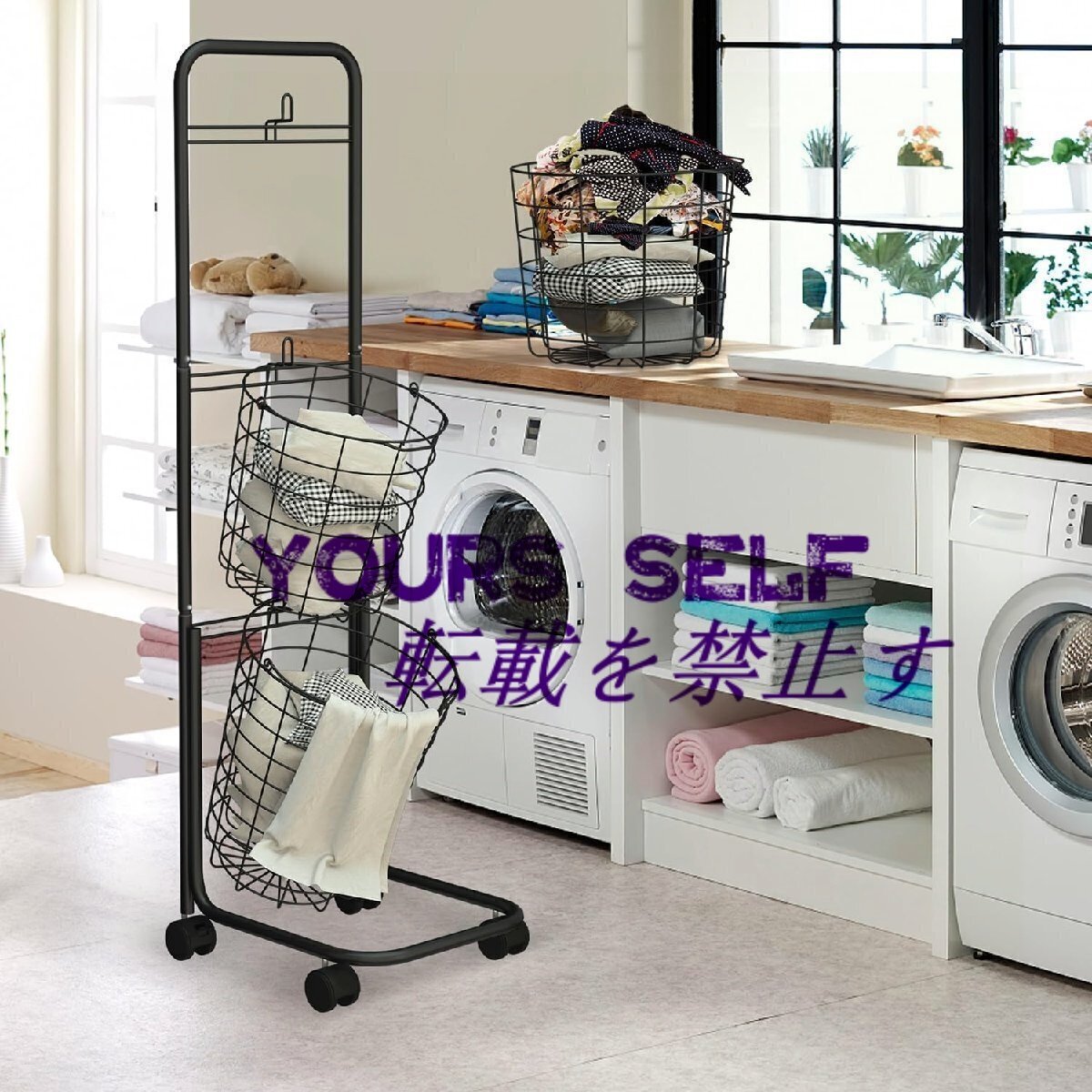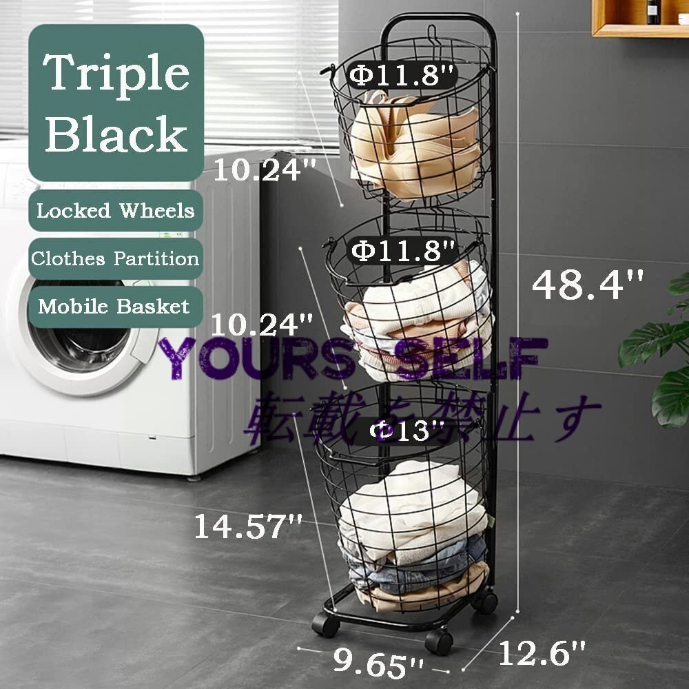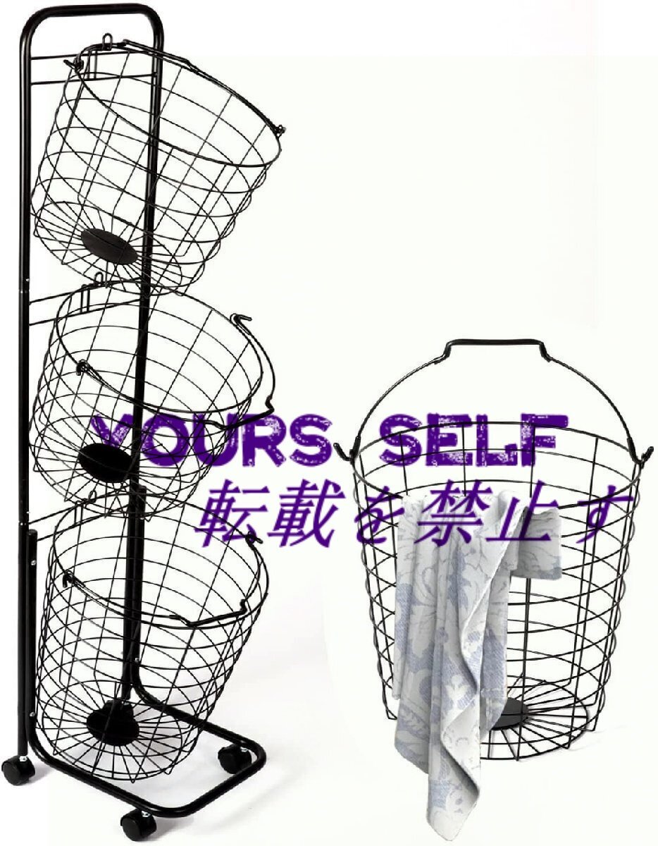 【大容量】: 3段ランドリーバスケットの全体寸法は48.4インチ X 12.6インチ X 9.65インチです。2つの小さなワイヤーバスケットと1つの大きなワイヤーバスケット、大きなキャリーバスケットサイズ: 14.57インチ X 13インチ、小さなワイヤーバスケットサイズ10.24インチ X 11.8インチ。