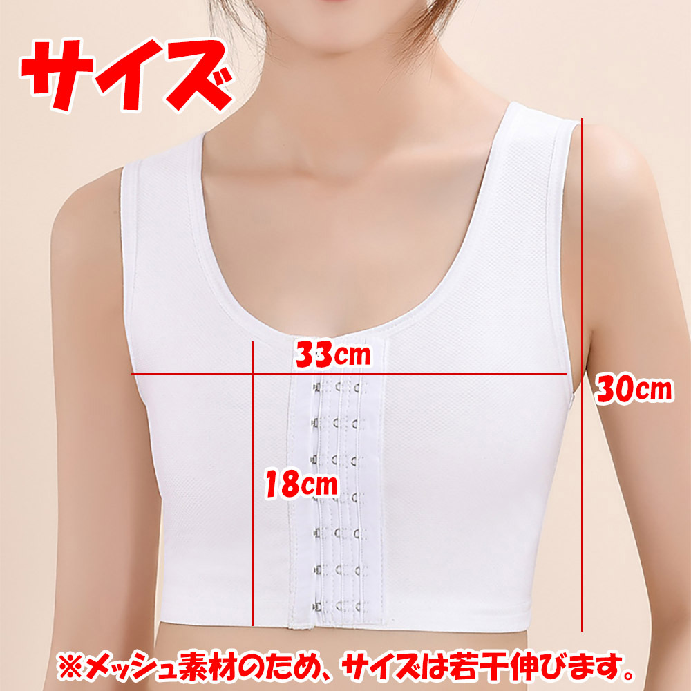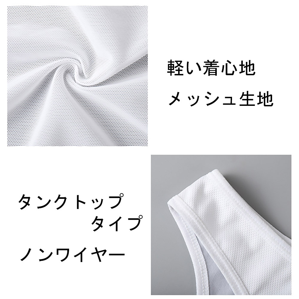 通気性の良いメッシュ生地を使用し、サラッと軽い着心地です。8連の3段ホックで微調整も可能です。肩が広めのタンクトップタイプで、ノンワイヤーの為、締めつけ感なく、長時間着用しても肩が痛くなりにくく、激しい動きも気にならないインナーです。