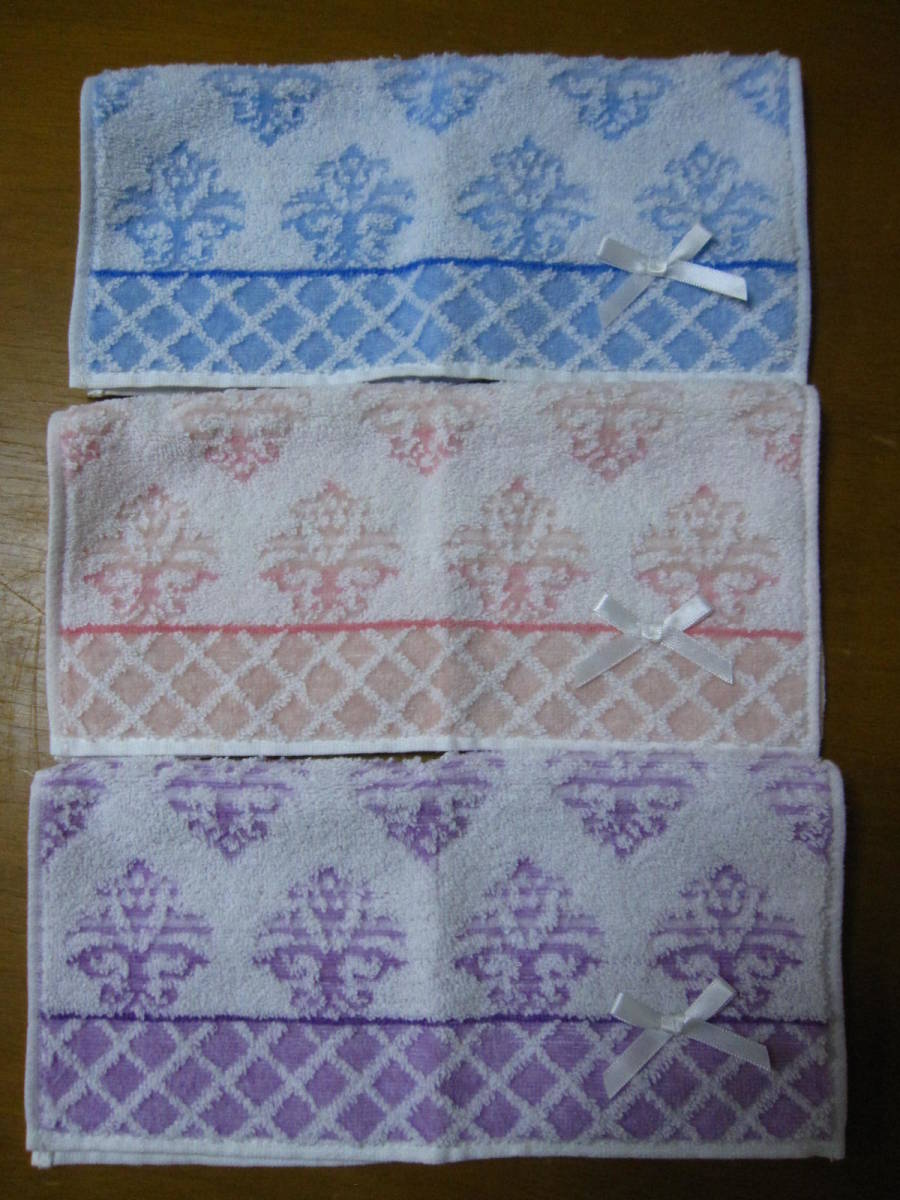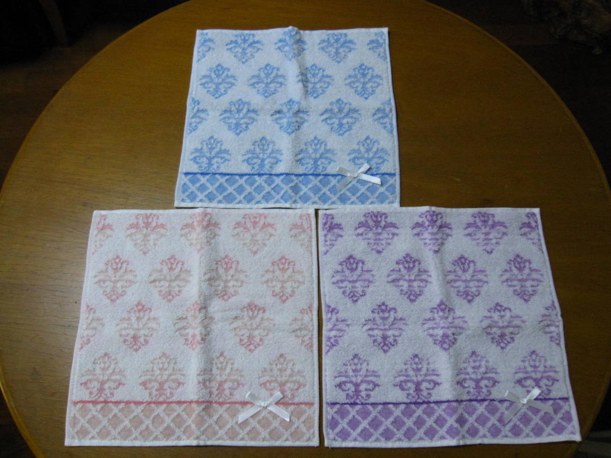 ハンドタオル 新品 3枚 セット ダマスク 格子 柄 模様 リボン付 ハンカチ 男女 兼用 秋 冬 カラフル 綿 可愛い お洒落 格安 まとめて 色違
